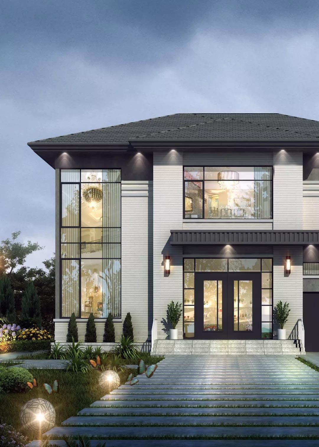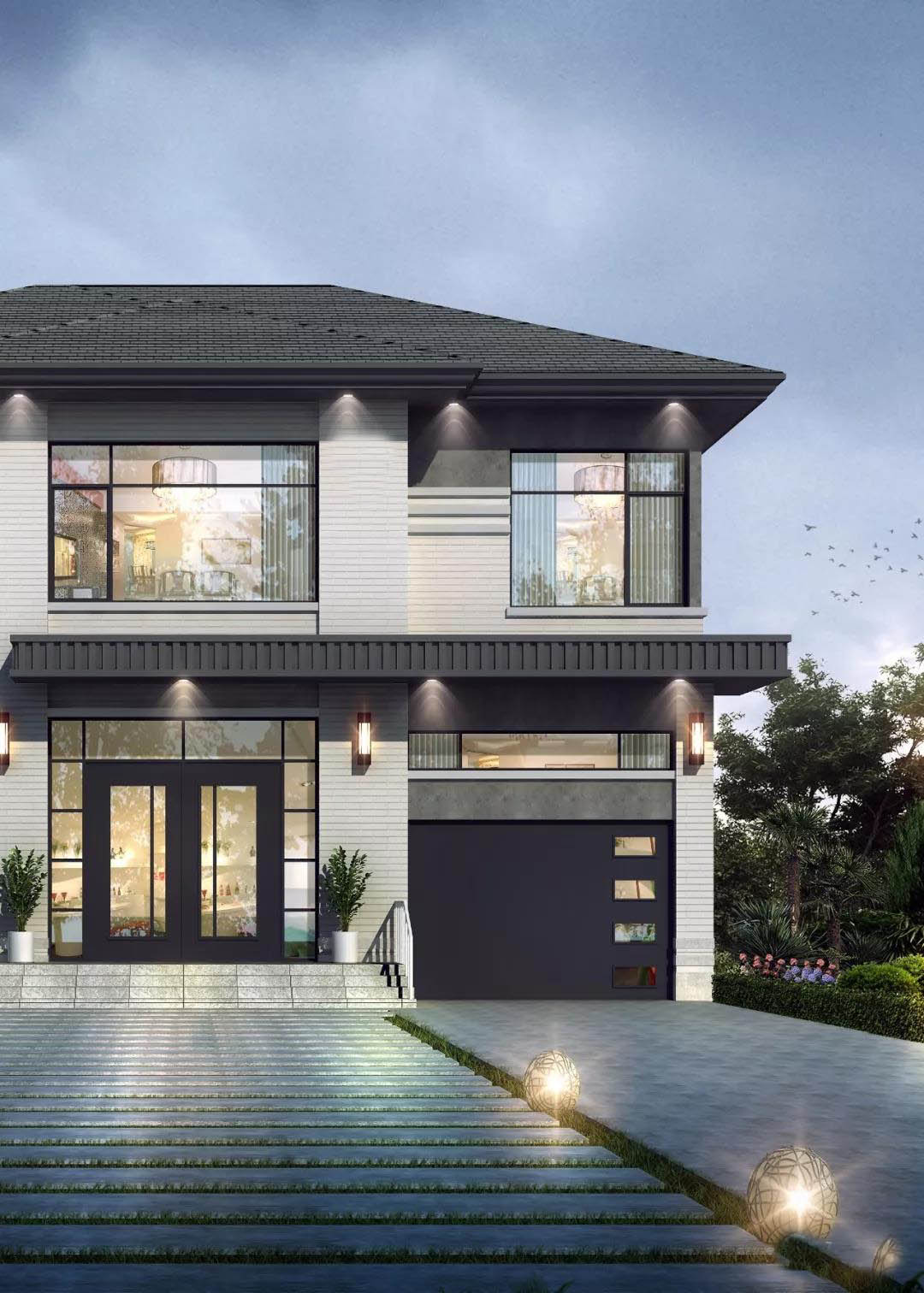 别墅外墙以浅灰色和深灰色真石漆搭配装饰,层次分明,线条感干净利落,多窗设计,清新明亮。