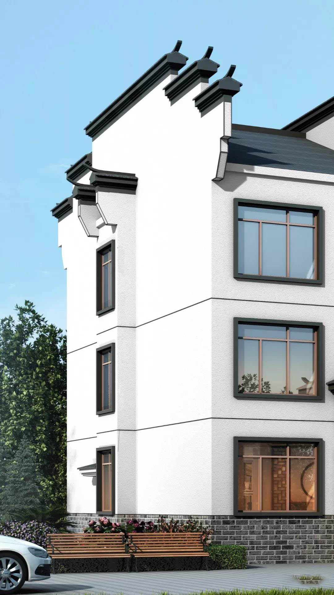 别墅外墙以白色涂料为主,屋顶是灰色波形瓦,特色马头墙是亮点,高低起伏,韵律感强,传承传统建筑文化特色。