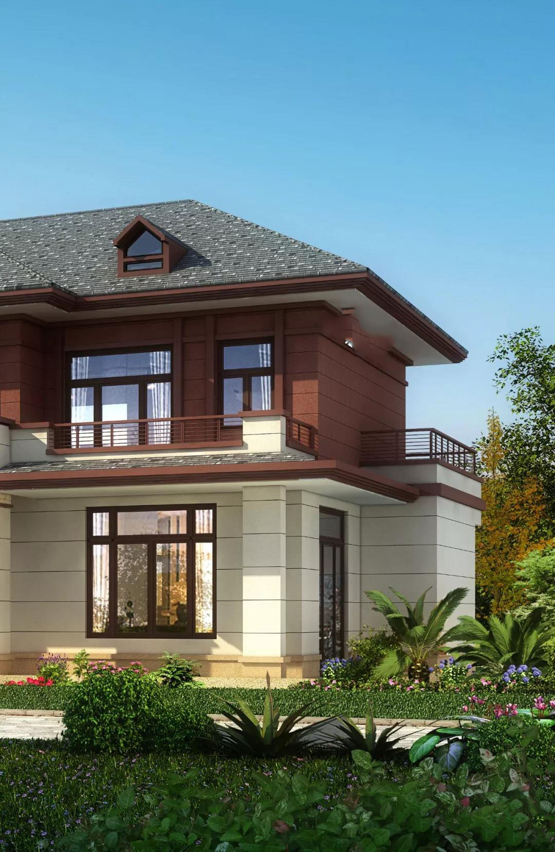 别墅外墙以米黄色和红棕色真石漆搭配,色彩上给人一种视觉上的协调,屋顶是灰色西班牙 ,2扇老虎窗,精致小巧,棕色真石漆点缀窗套、露台栏杆,采光观景一级棒。