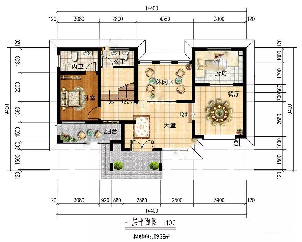 一层;大堂,体闲区,厨房和餐厅,还有一间公厕,一间卧室配套卫生间
