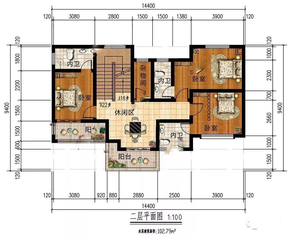 二层:体闲区,小杂物间,三间卧室和正面朝向的阳台