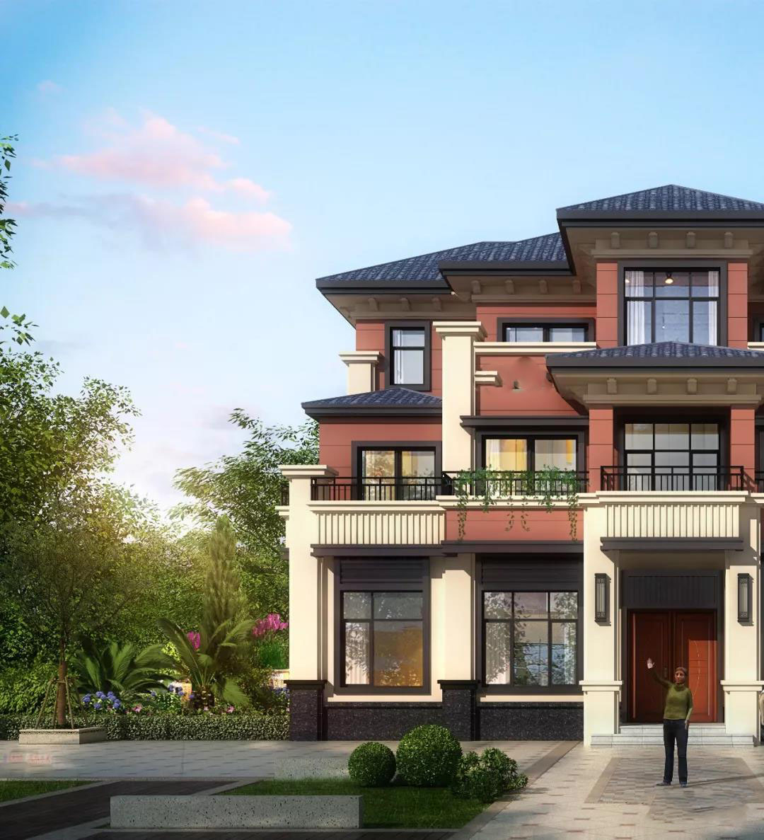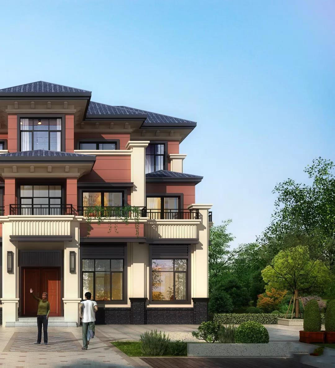别墅外墙以红色真石漆装饰,屋顶是灰色西班牙瓦,灰白色真石漆点缀方形柱、檐线、腰线,别墅整体看起来层次感丰富,富有格调。