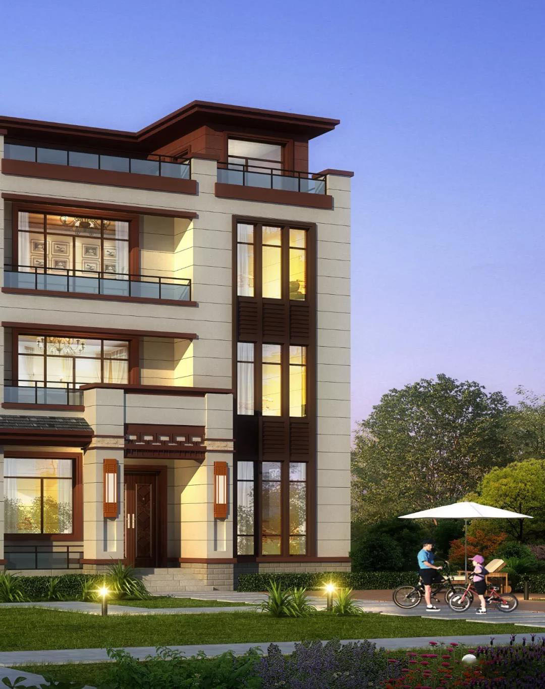 别墅外墙以米黄色真石漆为主,褐色真石漆点缀搭配,平屋顶设计,露台超多,带来舒适的居住体验。