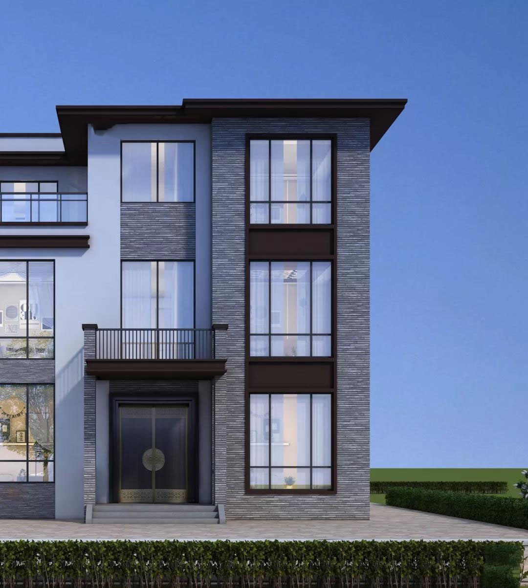 别墅外墙采用的是灰色外墙砖和白色真石漆搭配,别墅轮廓采用咖啡色真石漆进行勾勒,整体造型简约,却非常具有立体感。