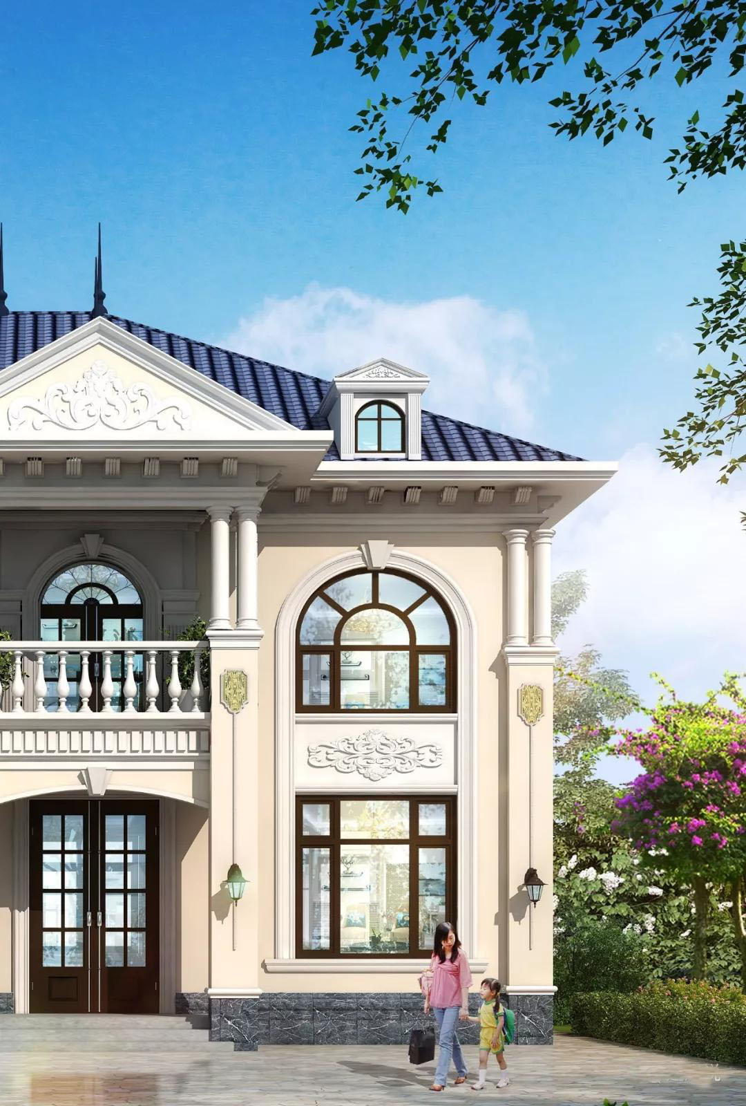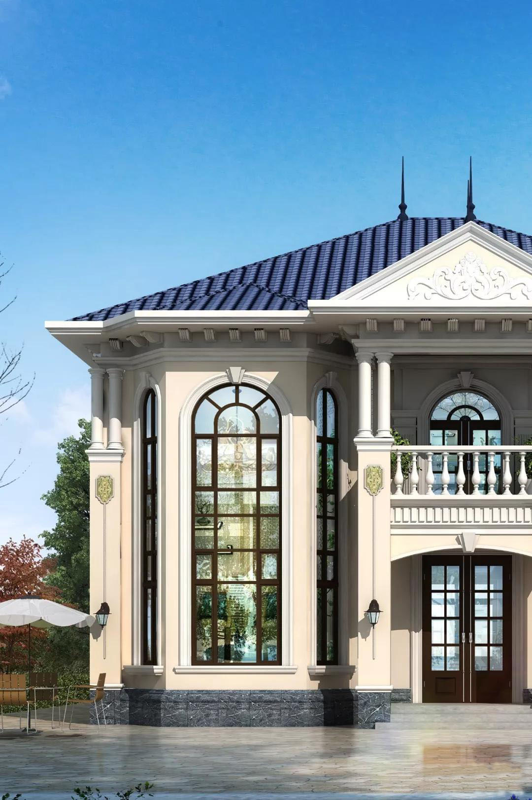 别墅外墙主体以浅色真石漆为主,屋顶搭配蓝色西班牙瓦,线条装饰门窗和屋檐,搭配精美的花瓶围栏、山花和老虎窗,华丽感十足。