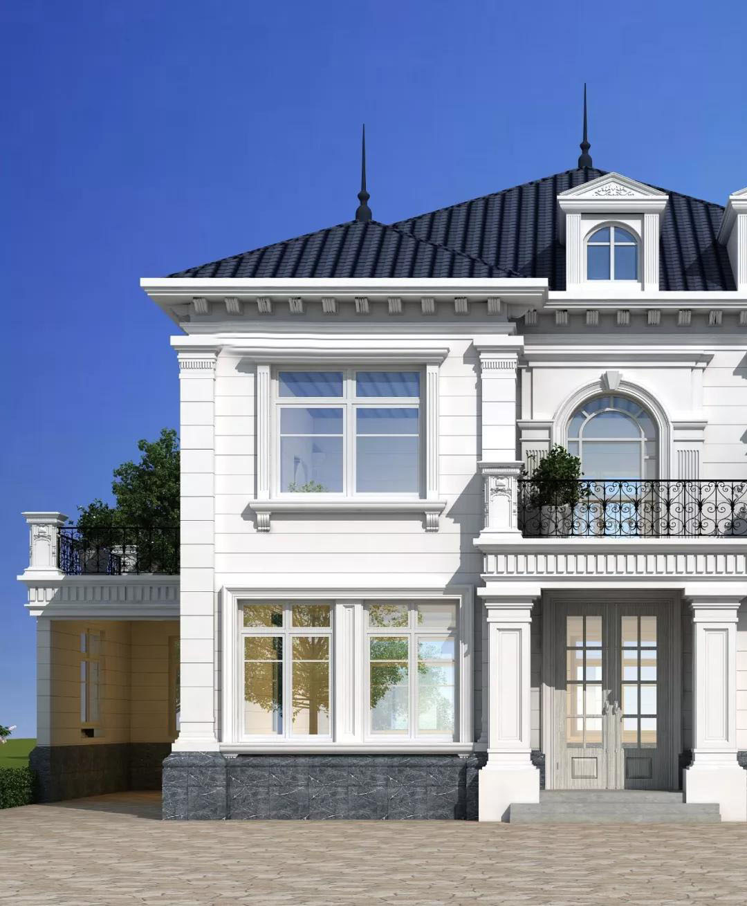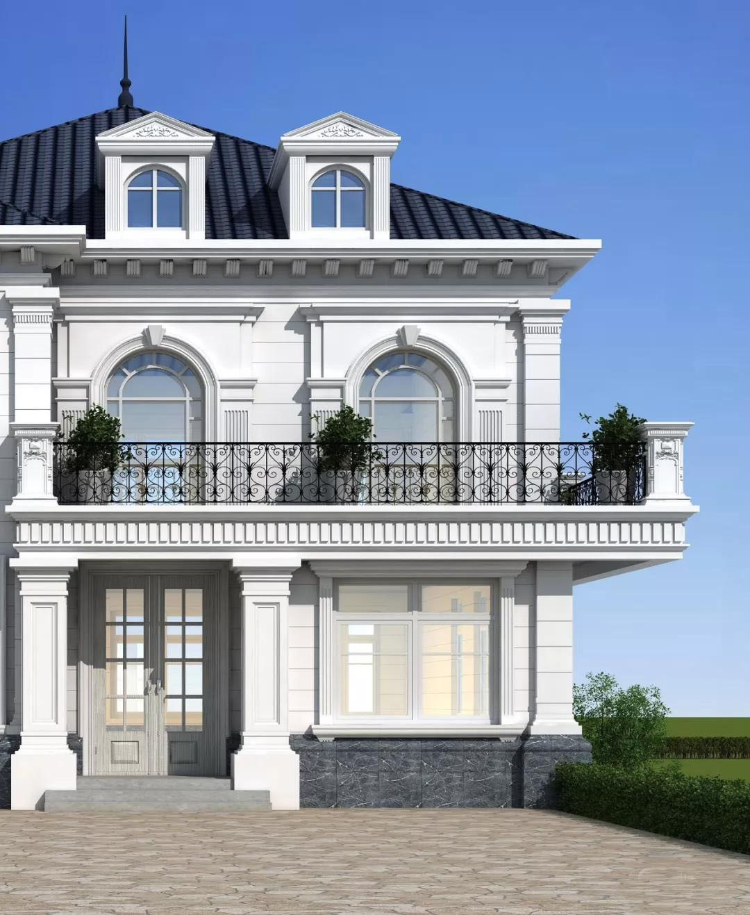 别墅屋顶采用的是宝蓝色波形瓦,外墙是白色真石漆,墙角用的是浅灰色外墙砖,再搭配上精美的铁艺花纹围栏、吸睛的老虎窗点缀,浪漫气息十足。