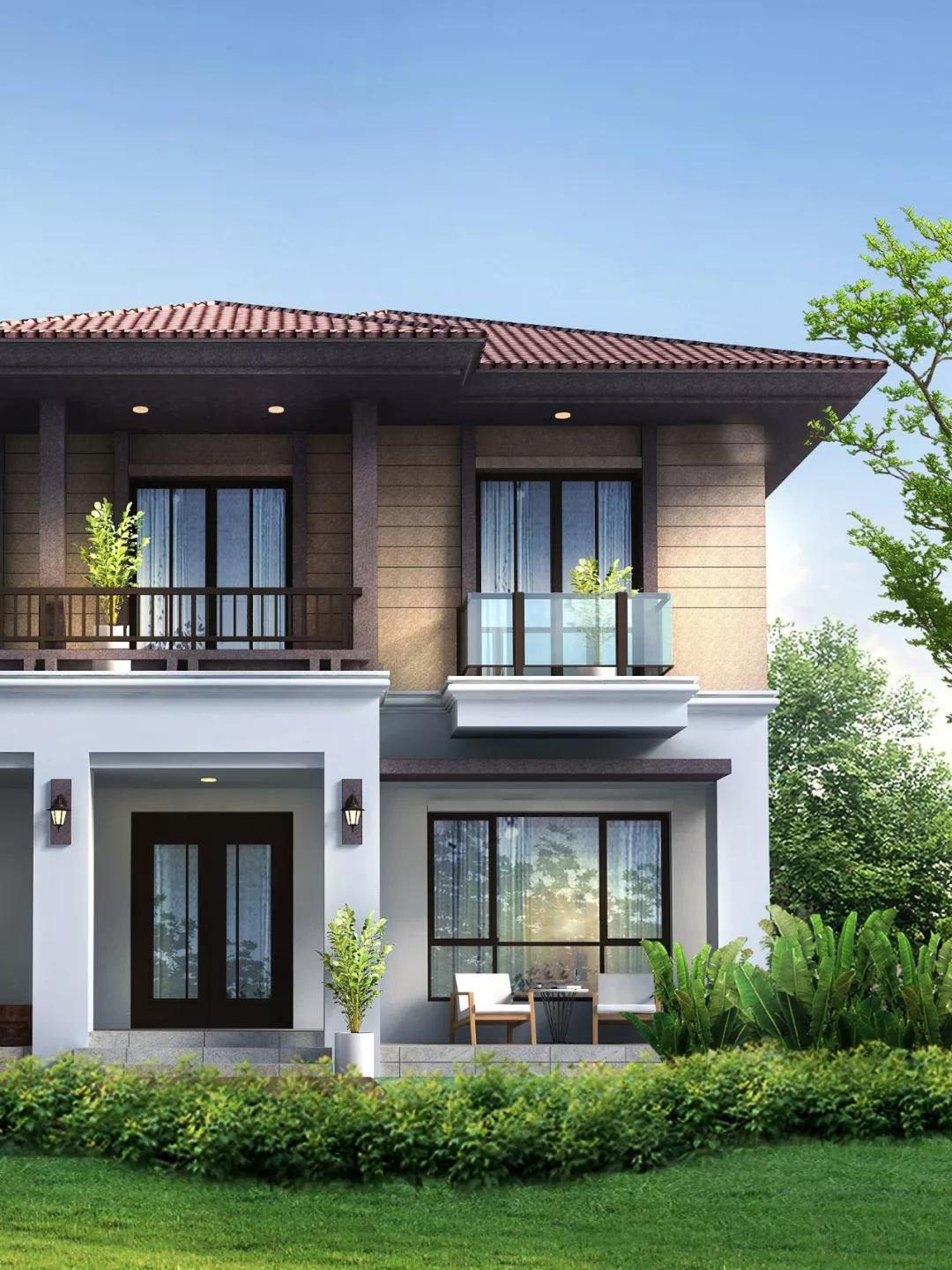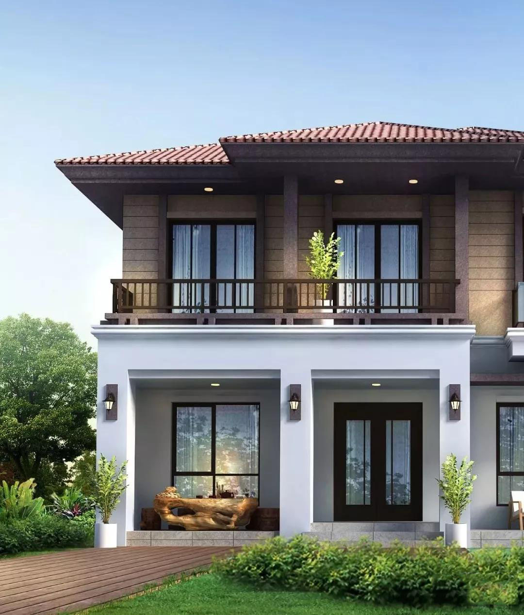 别墅屋顶是棕色的西班牙瓦,外墙以褐色和白色真石漆搭配装饰,讲究色彩的和谐,棕色真石漆点缀檐线和门窗等,满满的设计感。