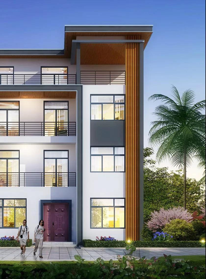 别墅外墙以白色真石漆为主,灰色真石漆点缀檐线、腰线、门窗等;平屋顶设计实用,体现潮流的审美品位。