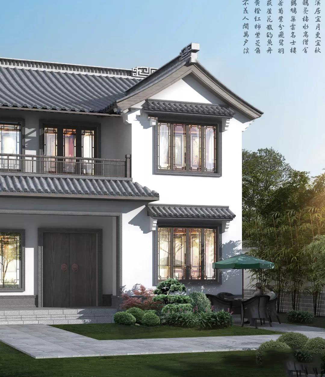 别墅屋顶采用的是灰色波形瓦,外墙白色真石漆,木质窗户、围栏,散发出浓郁古朴的气系