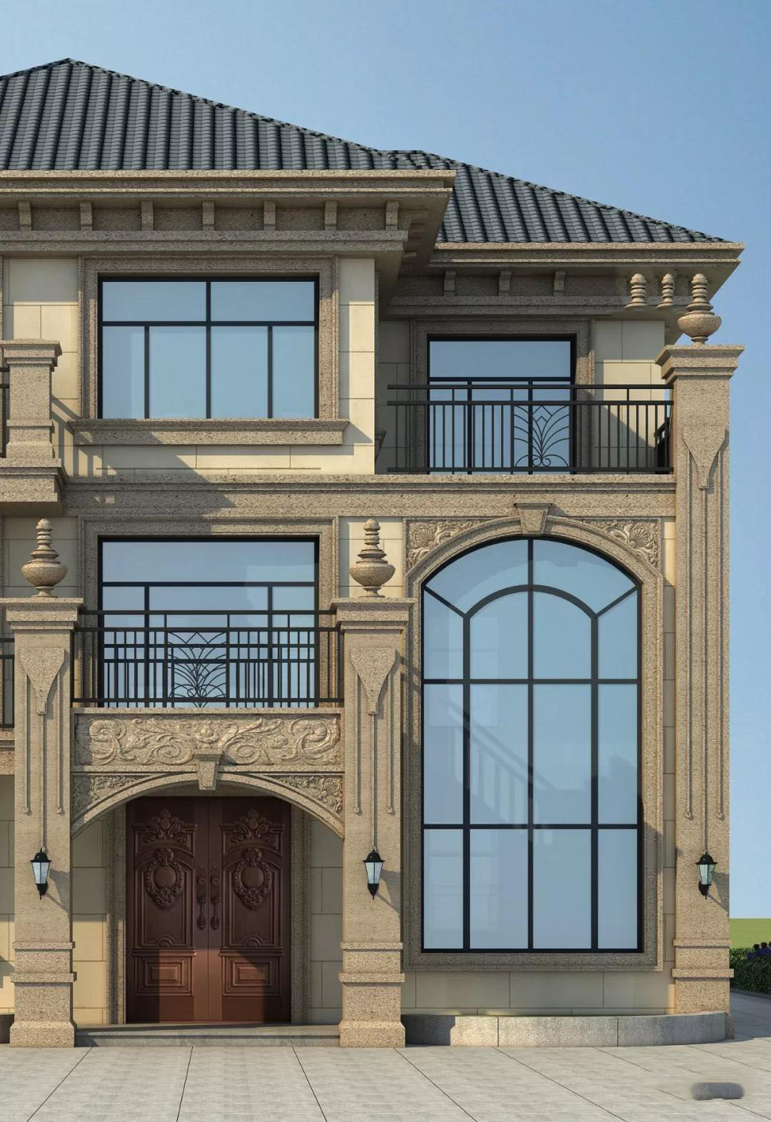 别墅屋顶是灰色西班牙瓦,外墙以米黄色贴面砖为主,精致的浮雕点缀墙面,通透落地窗,整体霸气十足。