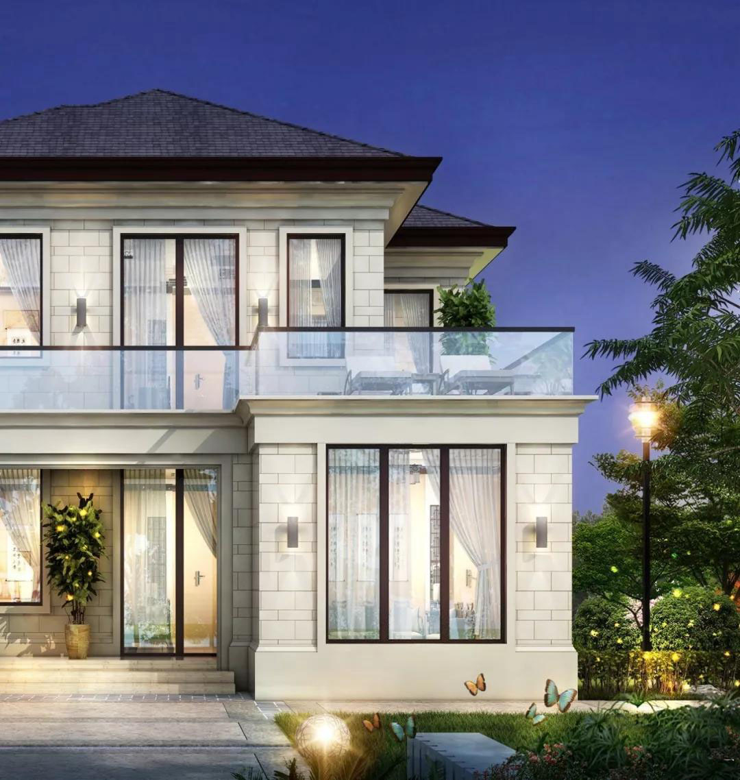 别墅屋顶是灰黑色波形瓦,外墙以米黄色贴面砖为主,多窗多玻璃露台,年轻又时尚