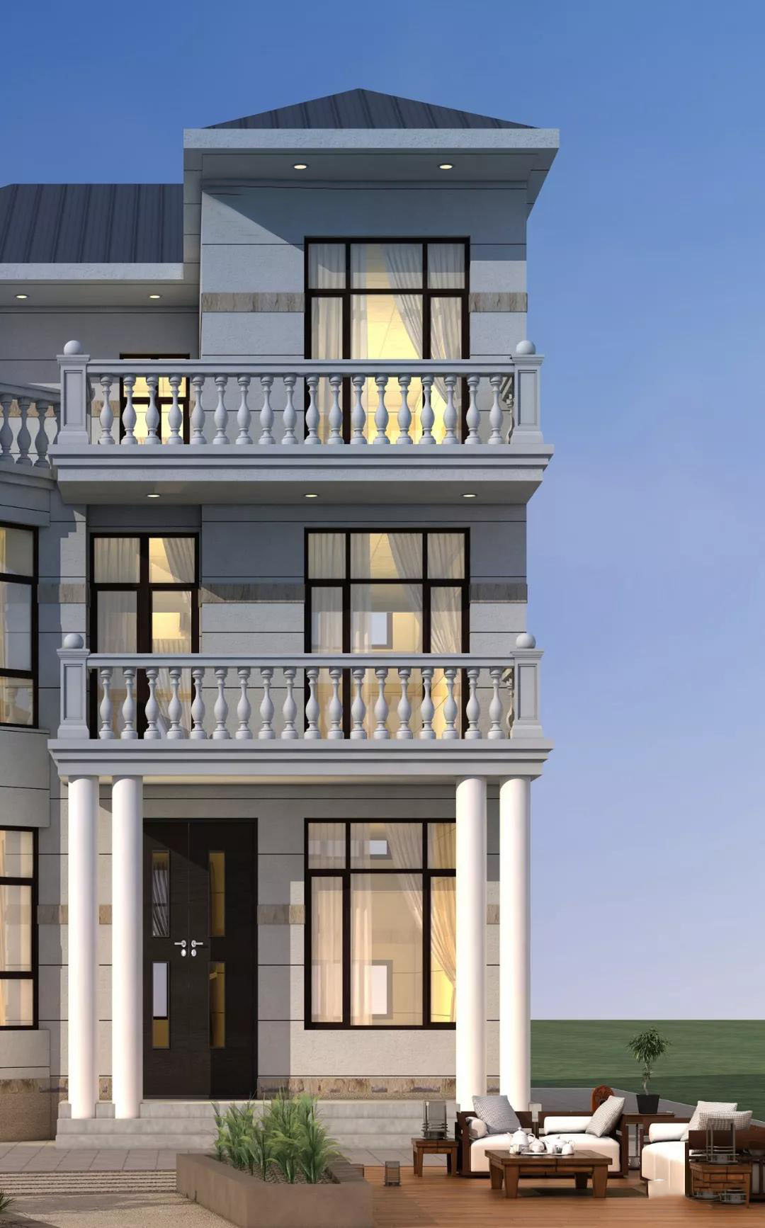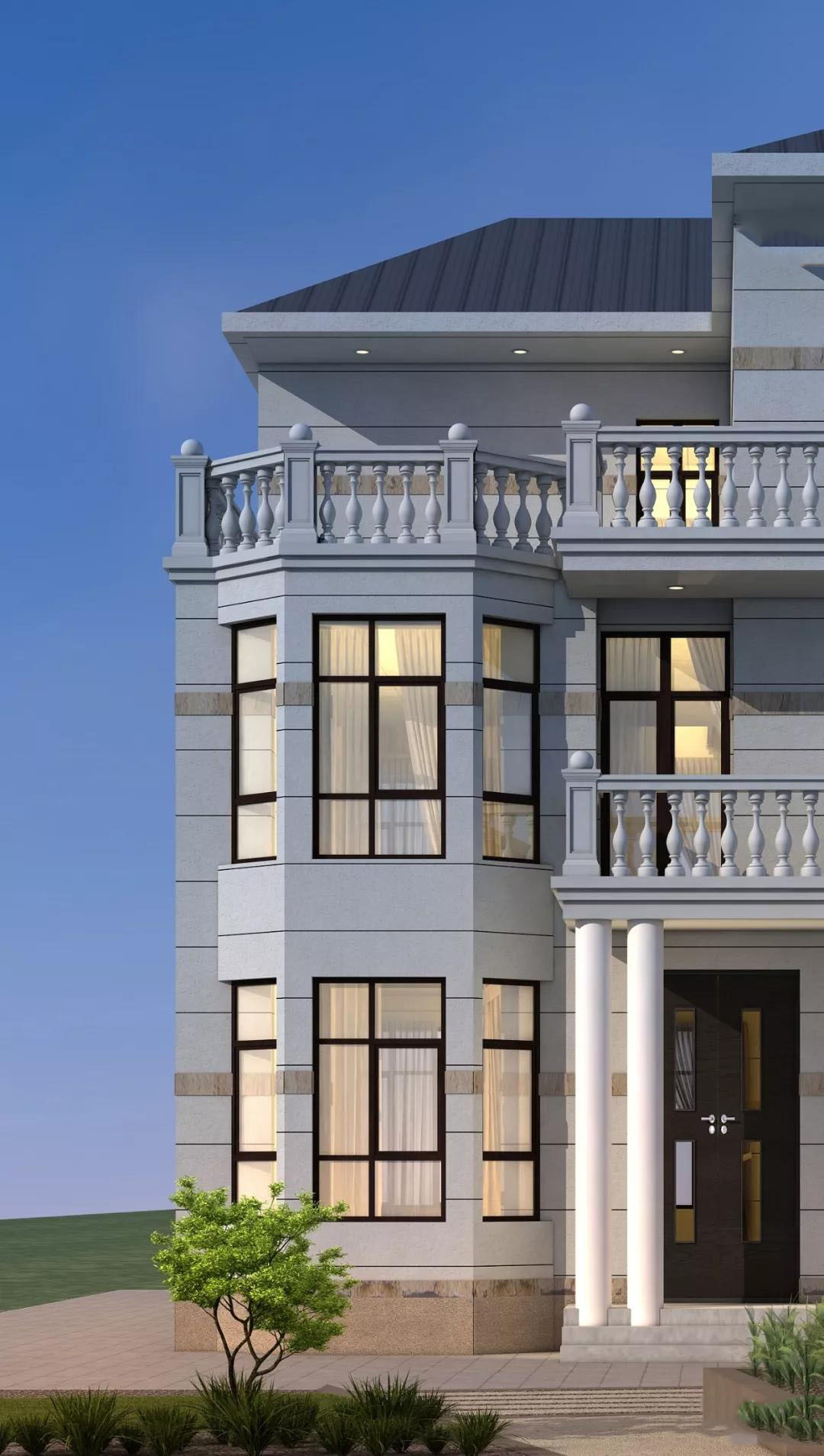 别墅屋顶是蓝灰色波形瓦,外墙主要用黄色真石漆装饰,霸气的罗马柱,精致的八角窗,别墅整体看起来非常精致,秀气。