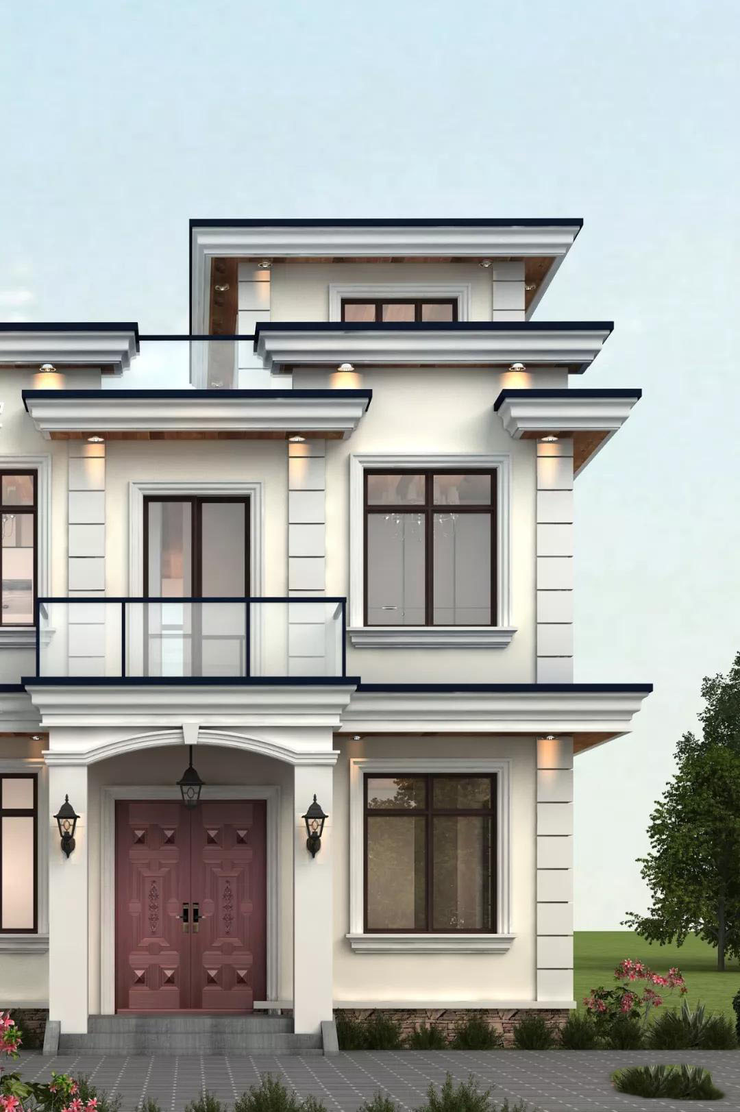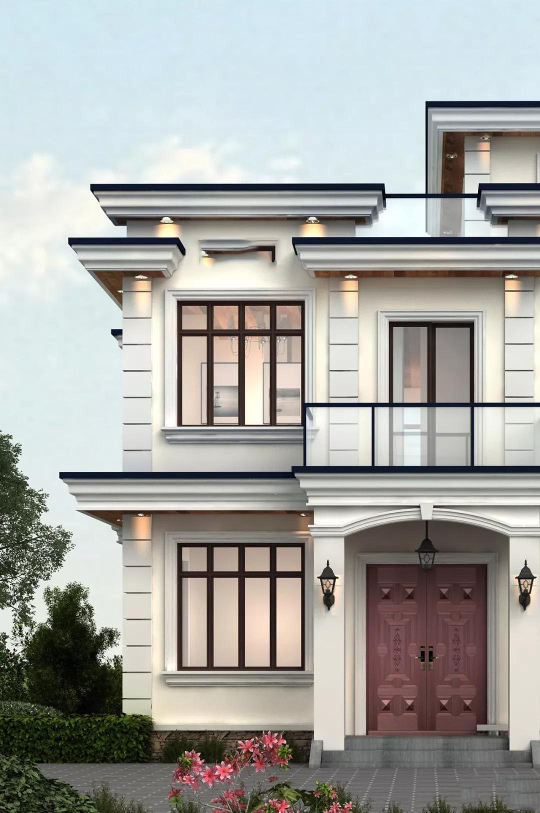 别墅外墙搭配乳白色真石漆,黑色真石漆装点门窗和檐线,墙角采用仿石材外墙薄板瓷砖,别墅整体简约大气,非常适合农村自建。