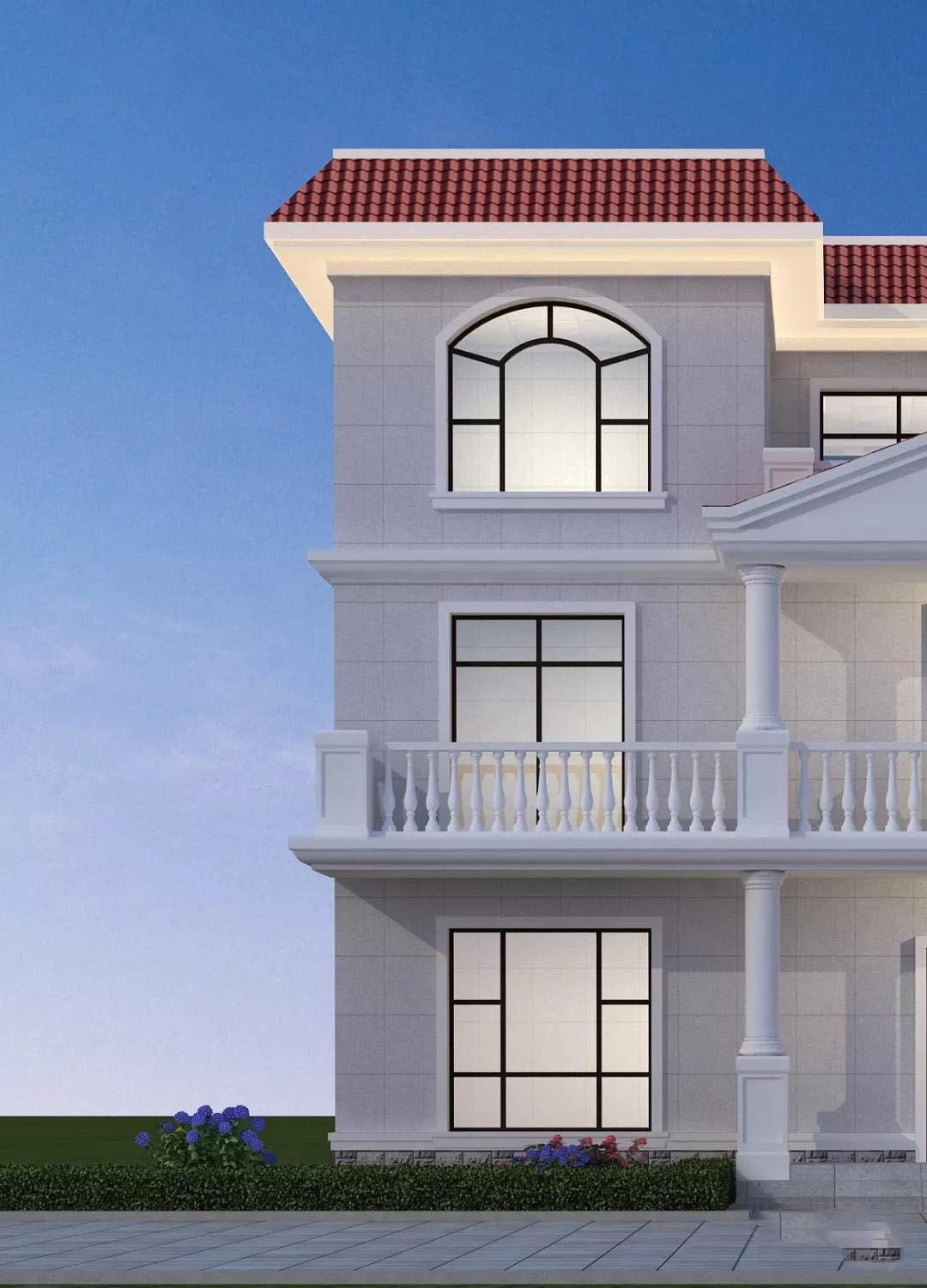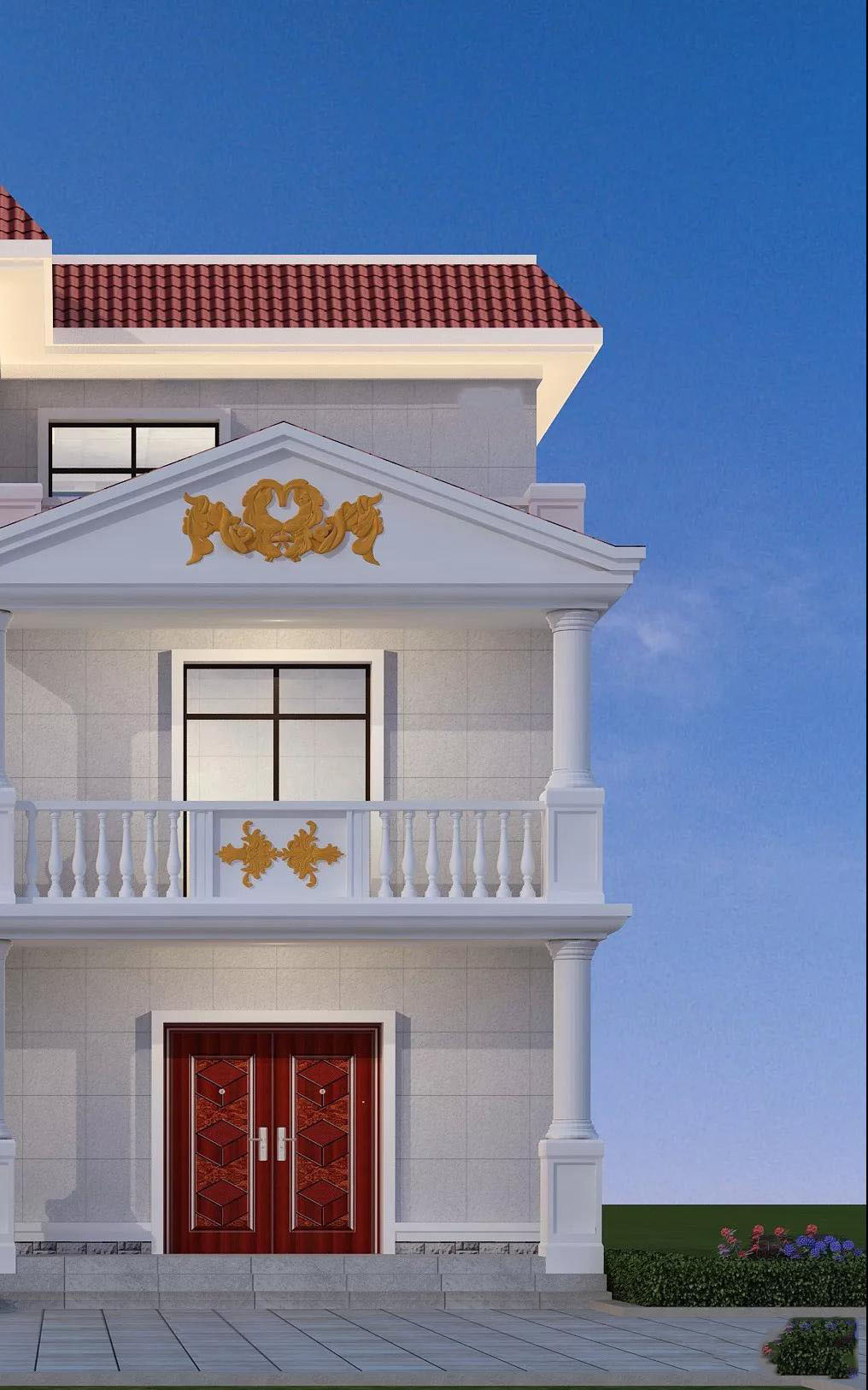 别墅外墙采用乳白色真石漆,做线条处理,规整有序;屋顶是红色波形瓦;精致的花瓶围栏,搭配金色的山花,使别墅外观更加精美。
