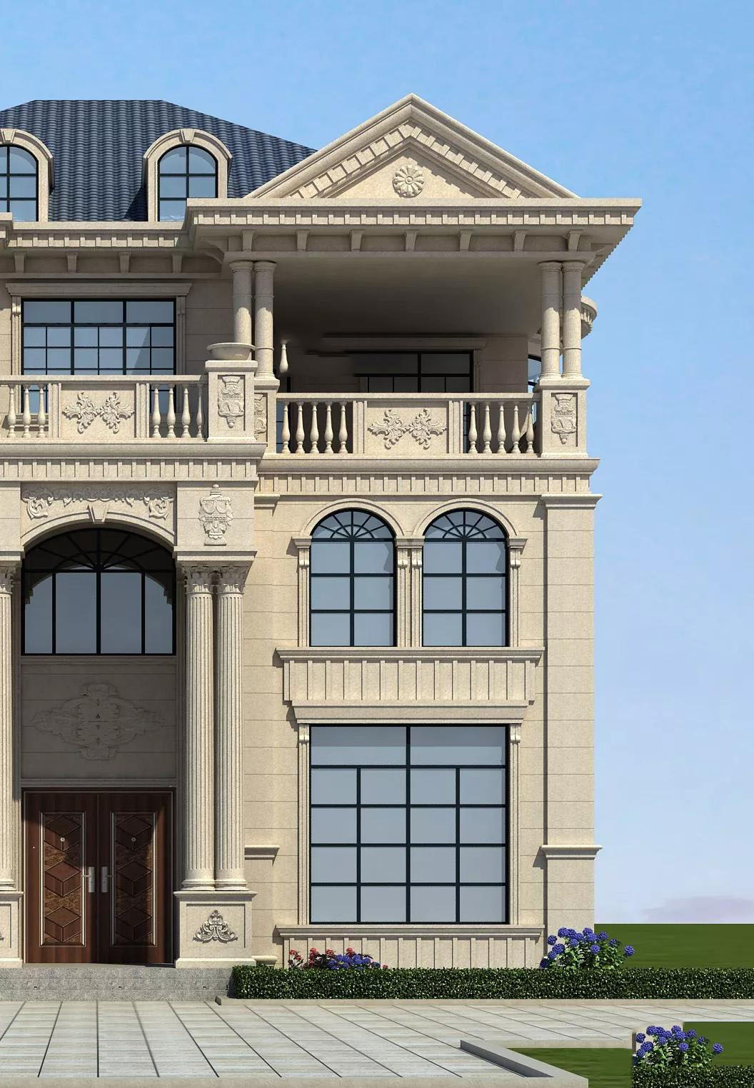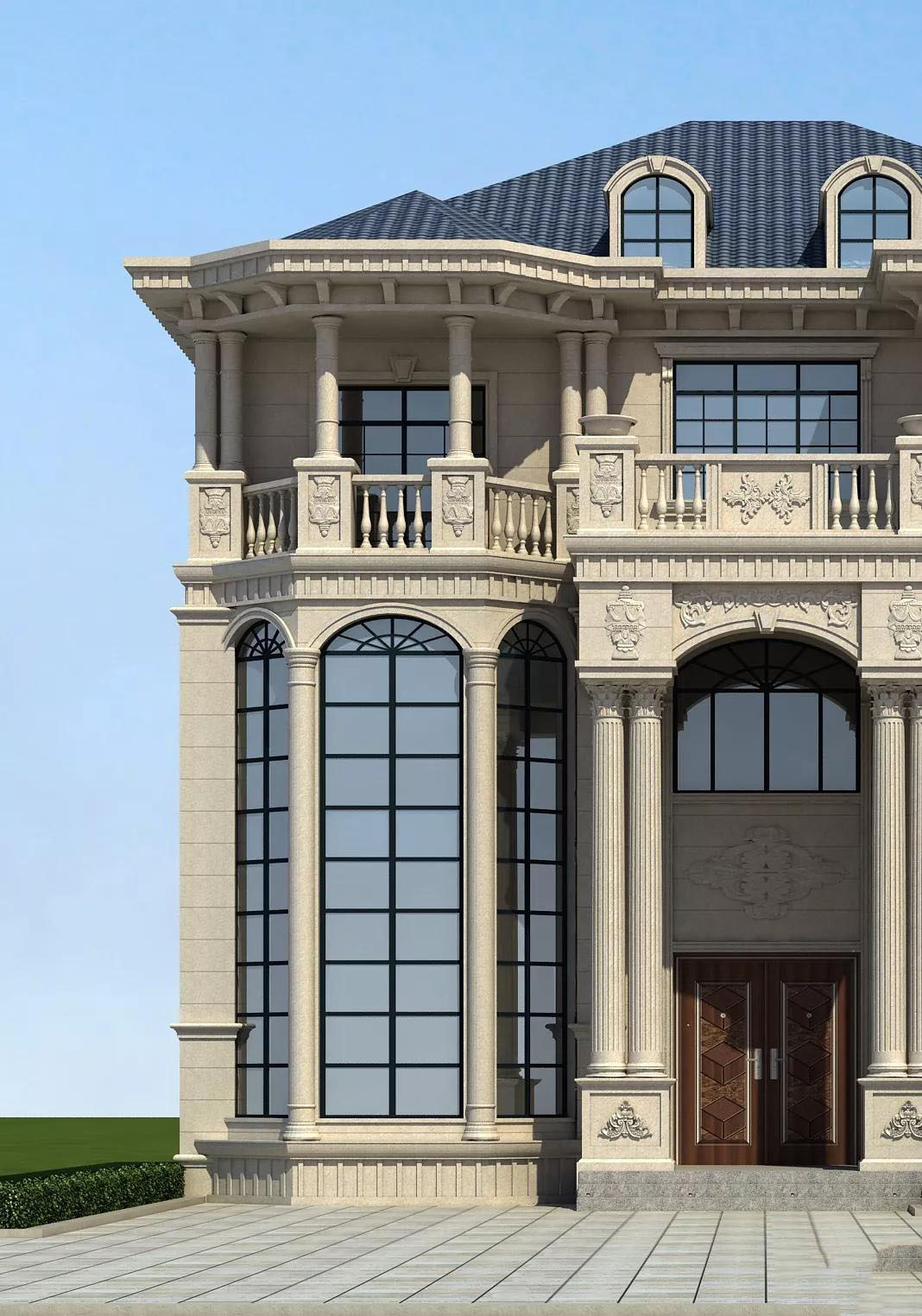 别墅屋顶是蓝色西班牙瓦,外墙主要是米黄色真石漆,大气的老虎窗,精致的山花,通透的八角落地窗,再搭配霸气的罗马柱,一眼就能看出别墅的“壕”。