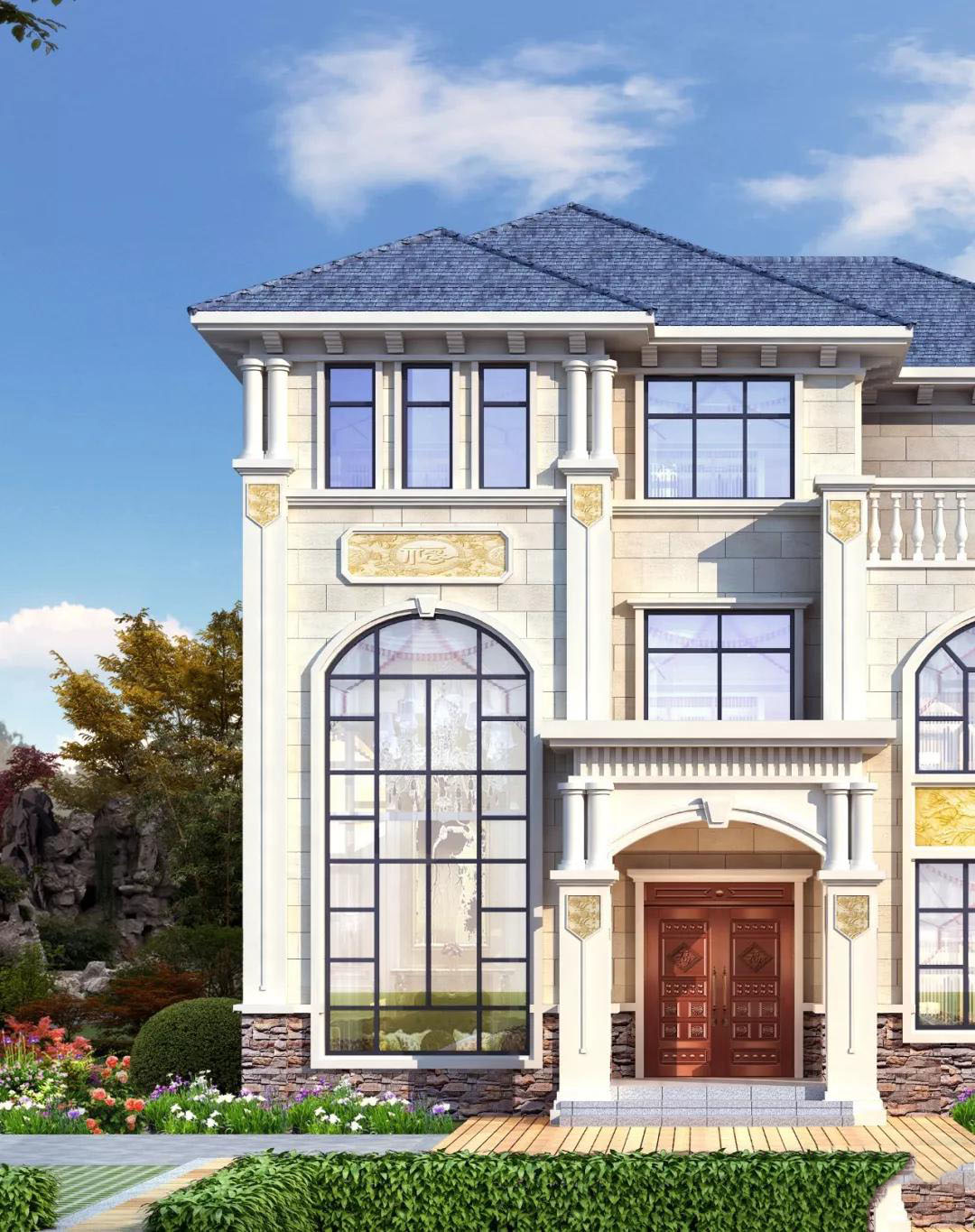 别墅屋顶是蓝色波形瓦,外墙以白色真石漆为主,墙角采用仿文化石外墙砖,白色真石漆点缀腰线和门窗,奢华的欧式浮雕,别墅高贵大气,符合乡村审美主流。