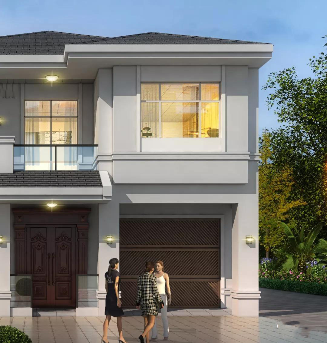 别墅屋顶和飘檐是灰色块瓦,外墙主要是米白色真石漆装饰,搭配通透的玻璃窗,在柔美的灯光下,别墅显得越发温馨。