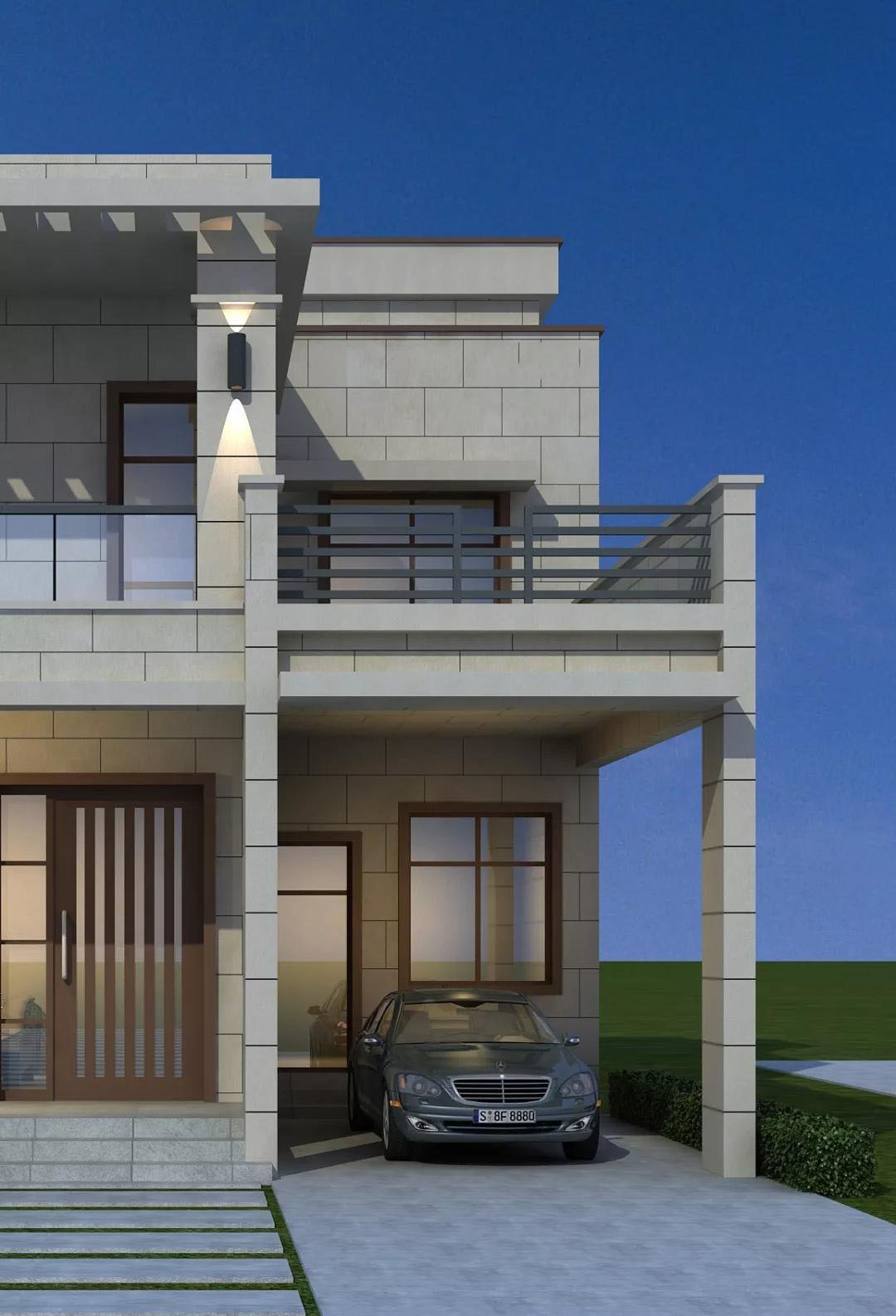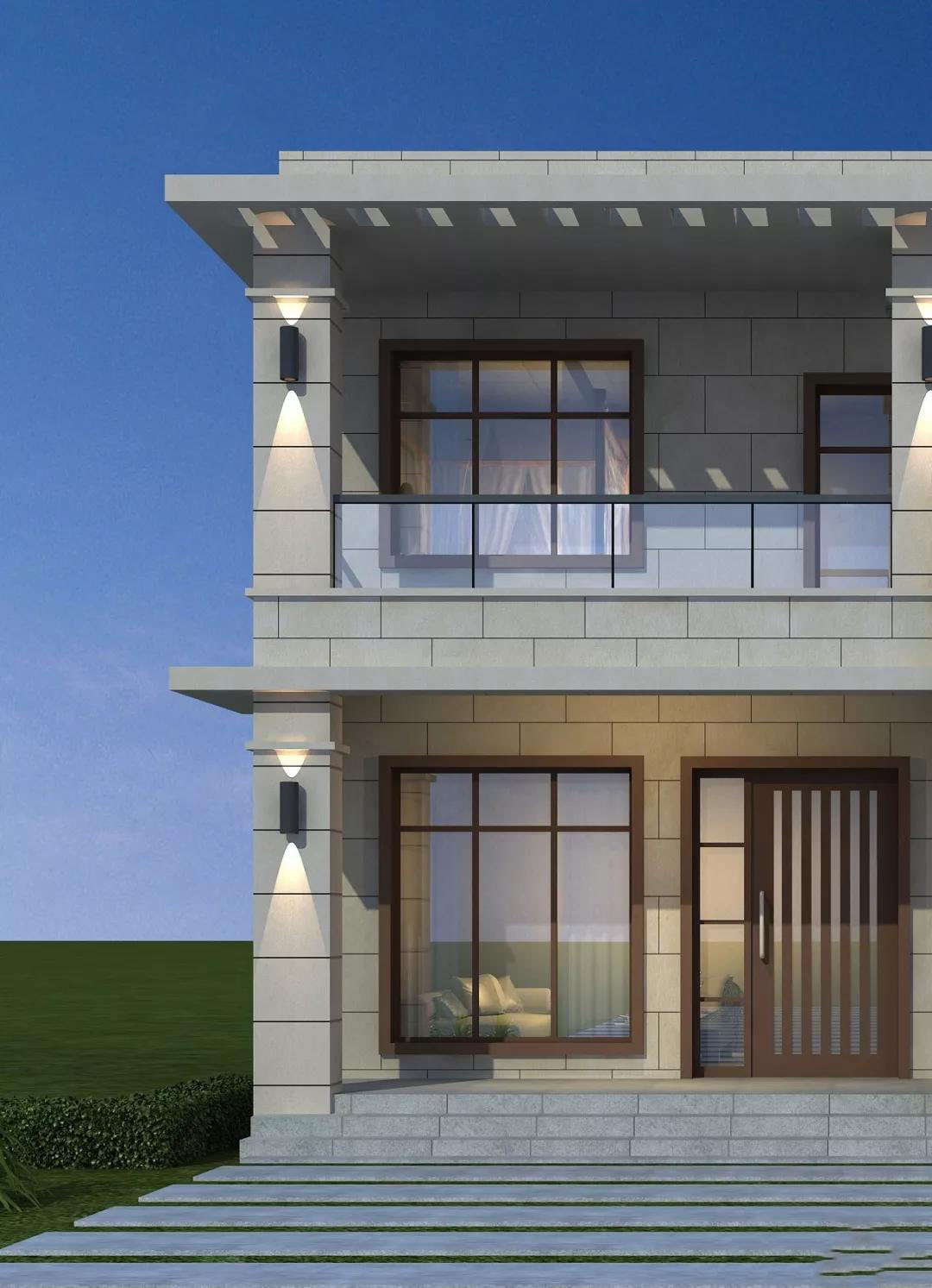 别墅外墙以浅灰色真石漆为主,用浅咖色真石漆装饰门窗,通透的玻璃窗和玻璃围栏,现代风元素十足,简约素雅。