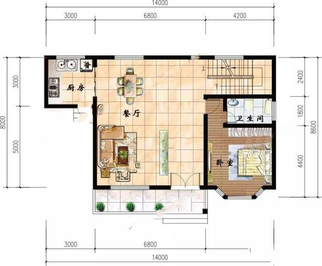 非常清新的一款小别墅,虽然没有过多的装饰,但是给人很雅致的感觉。独立设计的厨房,在农村很方便,可以单独做个柴火灶,不怕油烟没地方跑。所需的面积也不大,占地100平,建筑才300平,主体造价30万以内。