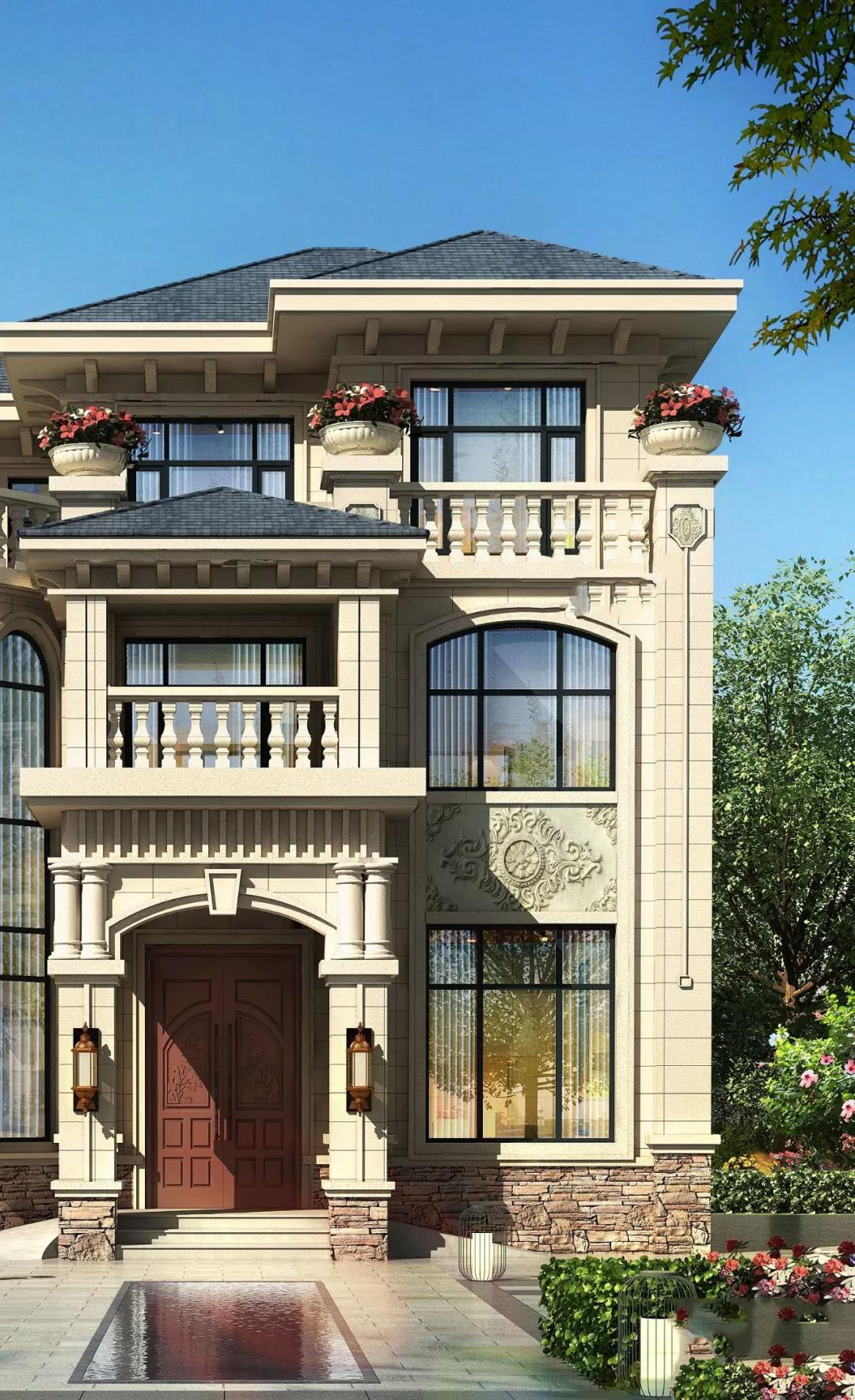 别墅屋顶是蓝色波形瓦,外墙以黄色真石漆为主,墙角采用仿石材外墙薄板瓷砖装饰,精致的花瓶围栏和浮雕,豪华贵气,展现主人非凡的实力。
