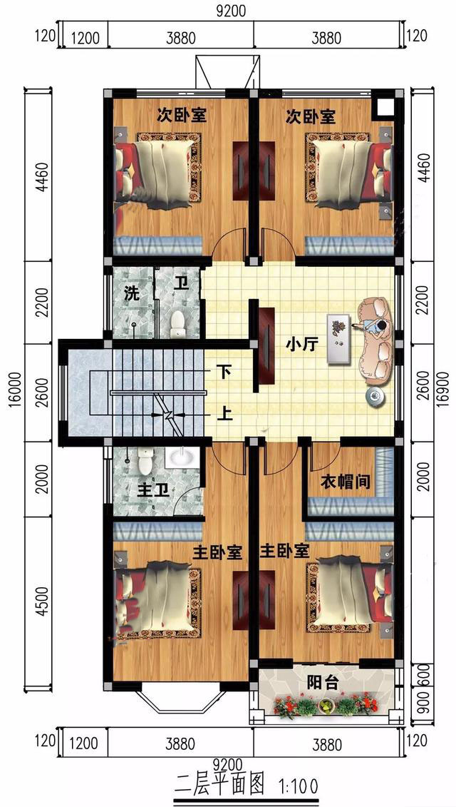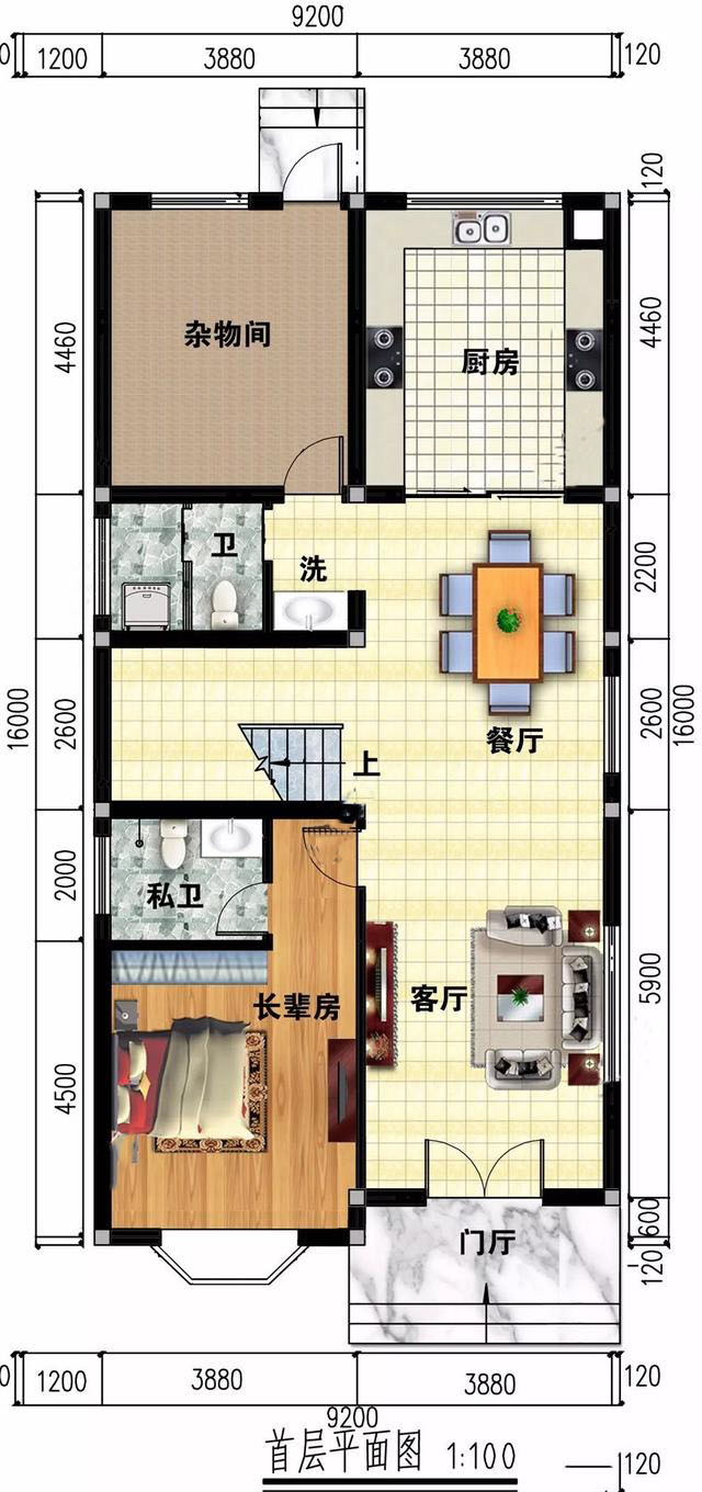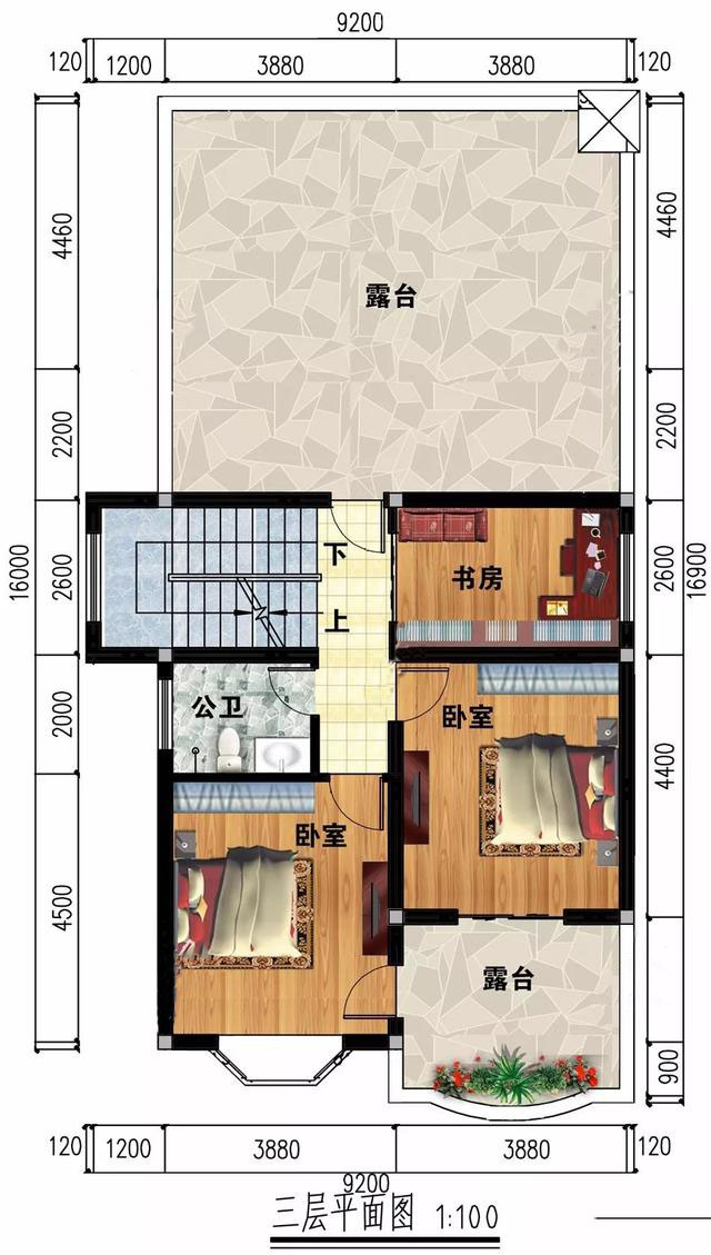 9.2×16米,小开间大进深的别墅,外墙面用面砖和真石漆装饰,斜屋面处配红色的釉面瓷瓦,搭配飘窗造型很立体。