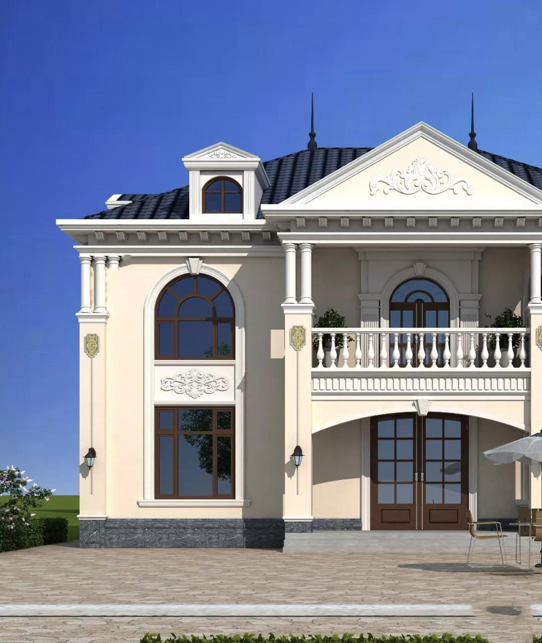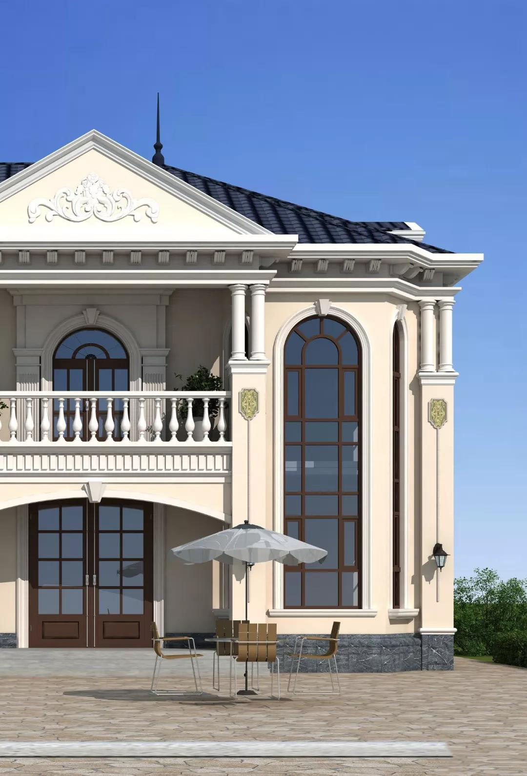 别墅屋顶是蓝色西班牙瓦,外墙以米黄色真石漆为主,墙角采用灰色真石漆,明亮的八角落地窗,老虎窗设计外加精致的花瓶围栏和浮雕,洋溢着高贵典雅的气息。