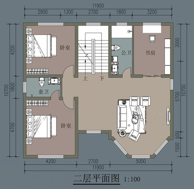 客餐一体化设计,丰富了空间阔度,提升了居住舒适度。同时多边形环绕落地窗的设计,可保证家中拥有充足的光照,提升视野。二层在三间卧室的基础上,增加了一个起居空间,以丰富二层住民的日常生活。书房若是不需要的话,可以改造成客卧,让家里的客人留宿于此。