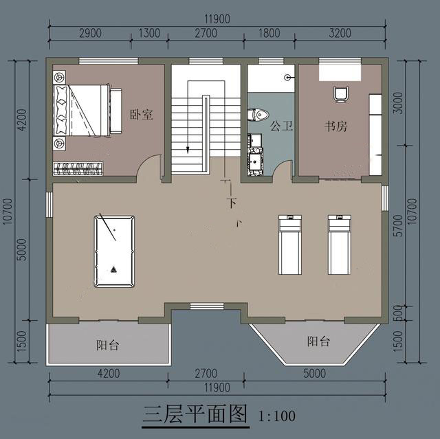 三层与二层的布局相差无二,增加了娱乐空间的面积,同时双阳台的设计,晾晒观景都有好去处,通风也有进一步的加强。