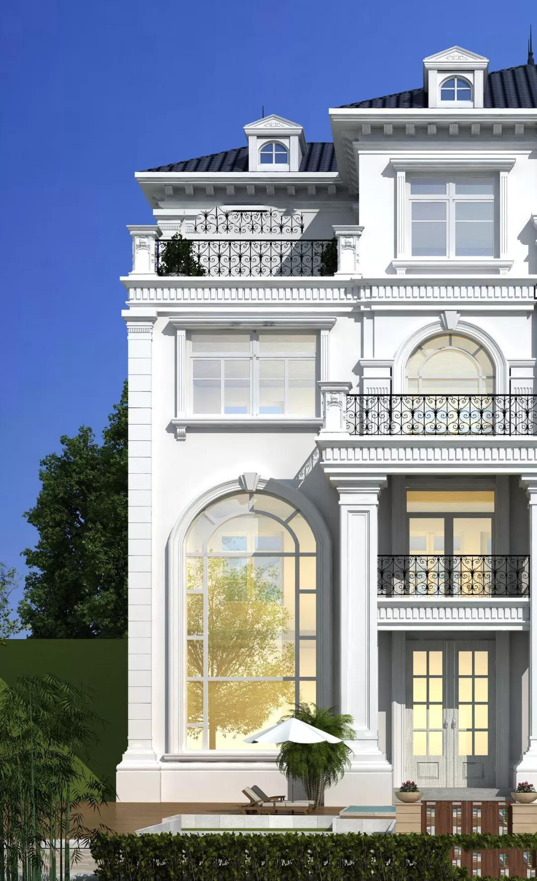 别墅建在斜坡上,地形特殊,屋顶是蓝色波形瓦,外墙以白色真石漆为主,通透的落地窗,精致的铁艺围栏,霸气的老虎窗,再配上精美的浮雕,典雅高贵的巴洛克风情立马显现出来。