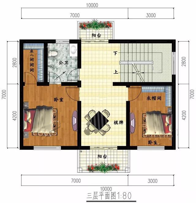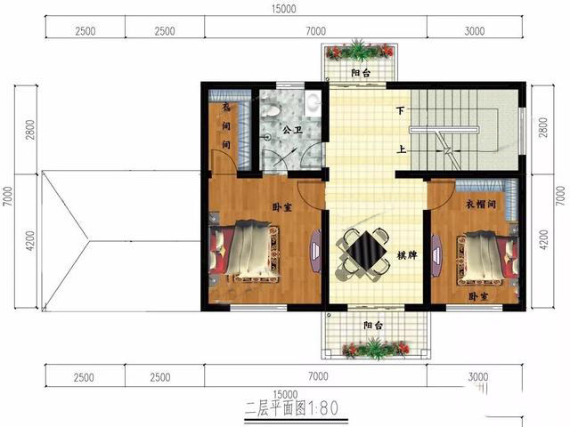 二层:设两间卧室,其中主卧带衣帽间和独卫,
