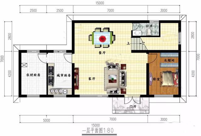 一层:设一室两厅一厨一卫,厨房分为两种,中式和西式,很方便实用,公卫放楼梯下面,