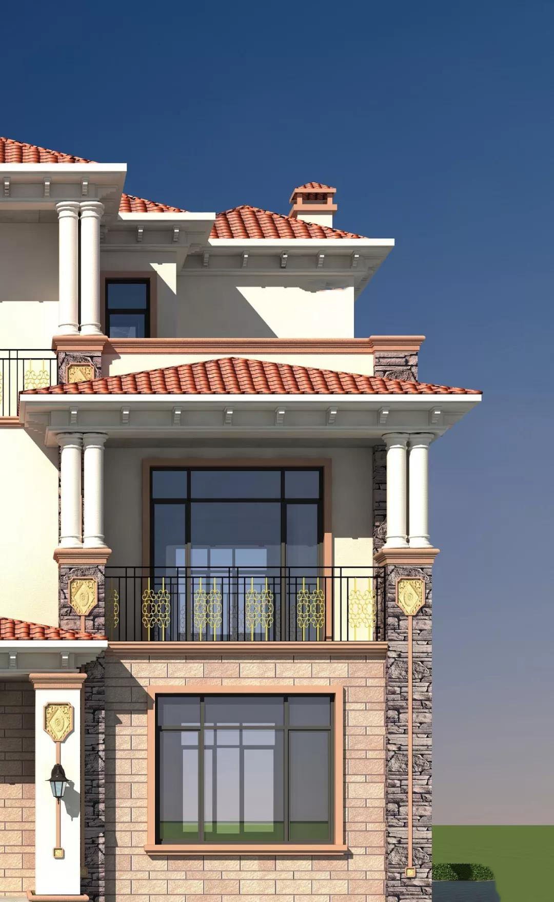 别墅屋顶是暖红色班牙瓦,外墙用白色真石漆和浅黄色外墙砖搭配装饰,再用暖红色真石漆装饰门窗,别墅用色丰富,在冬日里让人感觉非常温暖