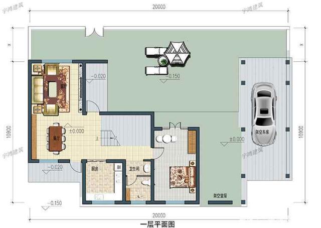 带庭院的中国式别墅外观效果图1层平面图