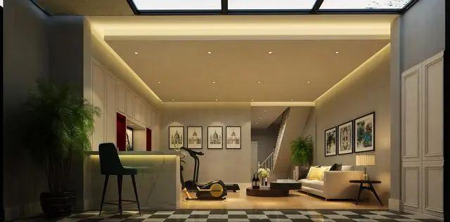 负地板用作休闲娱乐空间,包括视听室、健身区、水吧和休息室,贯穿整个大空间,享受绝佳体验。没有太多的装饰,通过独特的细节,如悬挂的图片和灯笼,我们可以添加神秘,创造一个舒适的感觉,符合生活。