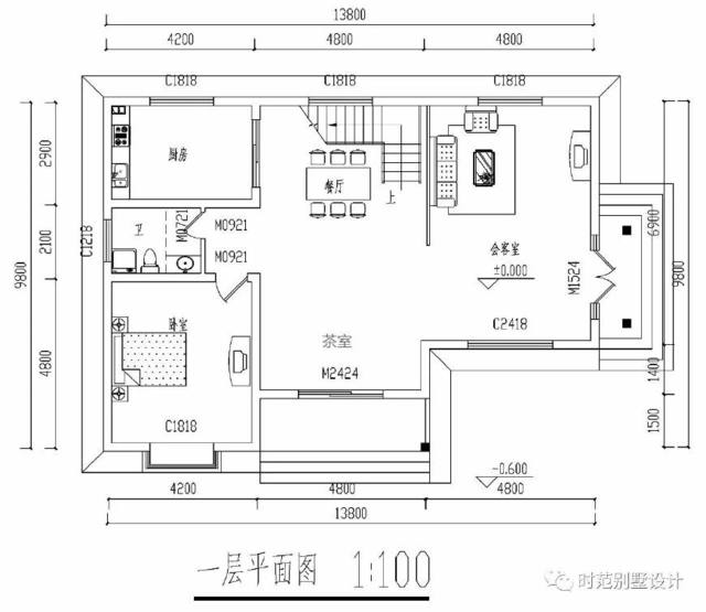 底层:有玄关、接待室、卧室、茶室、厨房、餐厅和卫生间,还有一间卧室,方便腿脚不便的老人。