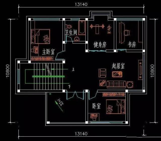 二楼还有两间卧室。不同的是,除了卧室,还有书房和健身房,这表明主人的生活质量相对较高。此外,楼梯旁边有一个直接通向阳台的通道,所以整个房间通风良好。
