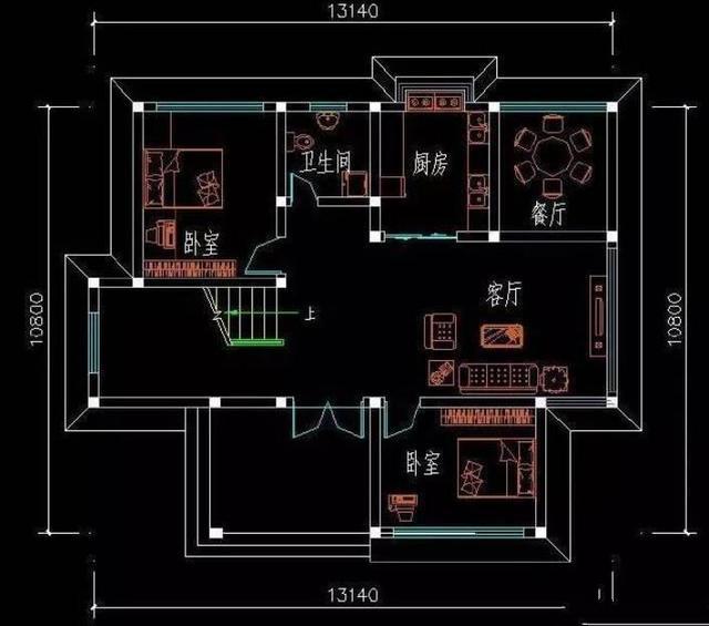 从第一层平面图,我们可以看到平顶别墅是13.14米宽,只有10.8米深。一楼有两间卧室。客厅、厨房、餐厅和卫生间都很紧凑,但进门后直接去二楼很方便。
