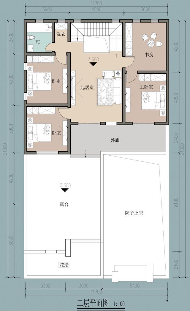 在二楼的平面图上,有三个卧室和书房,以及一个大客厅和一个大露台。从效果图中可以看出,凉亭露台安静舒适,适合喝茶。经计算,整个别墅有6间卧室和一间书房。当我住在这么小的四合院里时,我真的感到很自在。