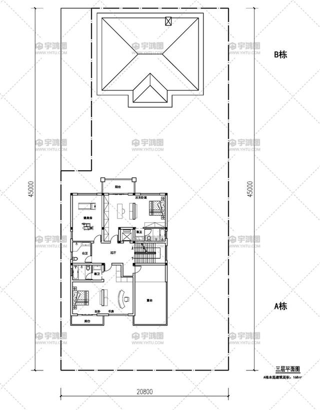 整个别墅宽20.8米,深45米,面积363平方米。
