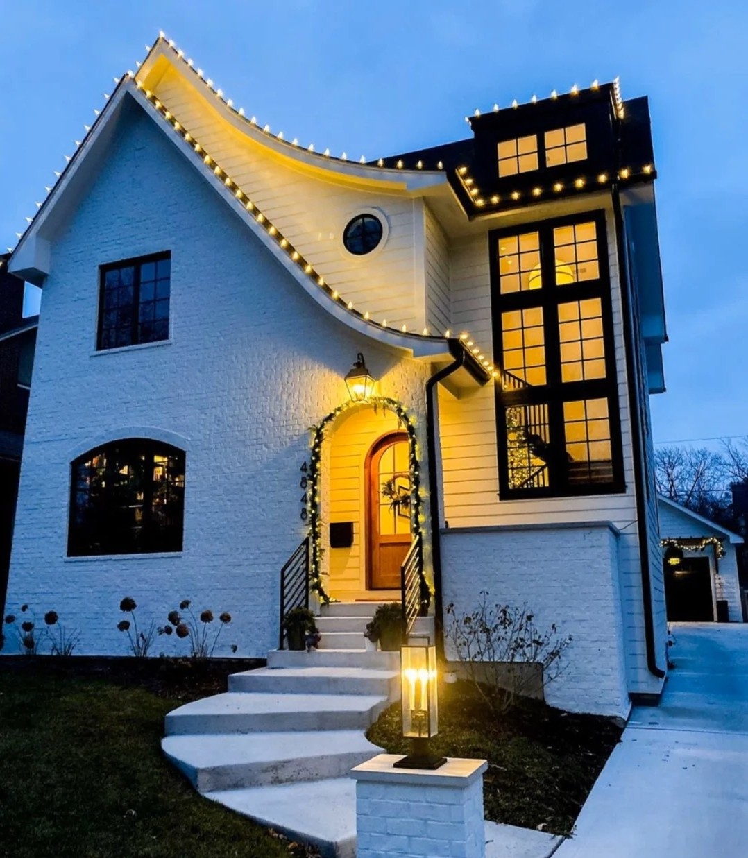 一左边的坡屋顶做了一个双坡的造型,这也是让整个房子看起来那么特别的原因,入口处蜿蜒的阶梯,也增加了建筑的曲线感,从风水学来讲,建筑的入口不能正对着主道路,这个房子的蜿蜒小路也是非常值得借鉴的做法。