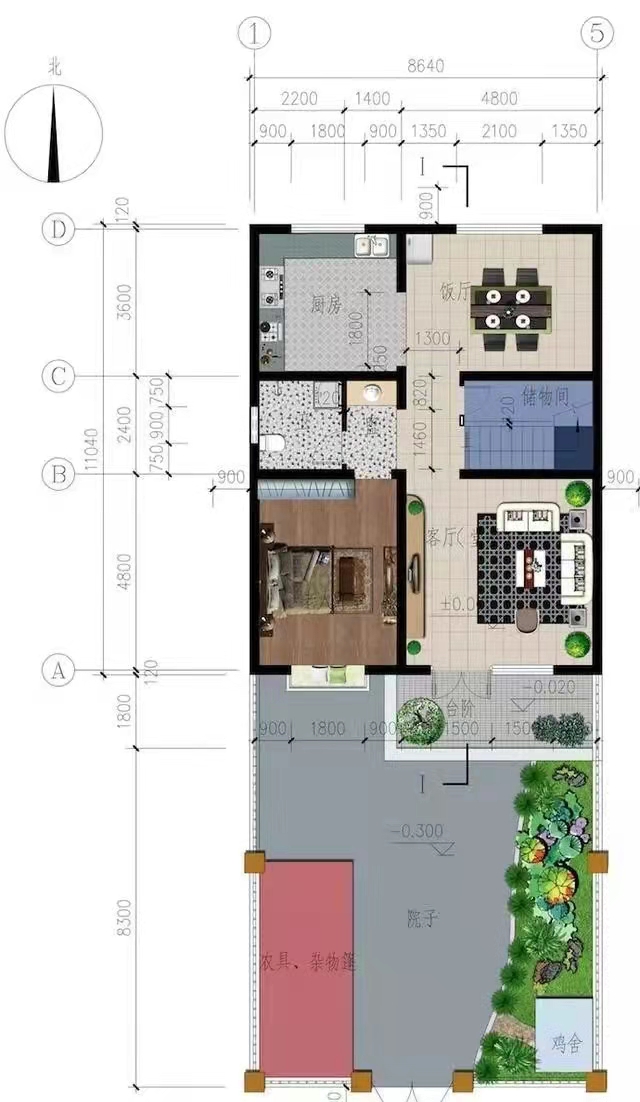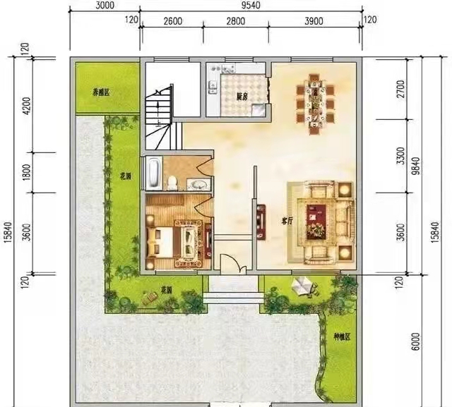 一层平面图:进门有玄关,右侧南向为客厅,北侧为餐厅,过年过节能摆好几桌;餐厅和厨房相连,传菜方便;西侧南向为老人房,紧邻卫生间,起夜比较方便。前边6米的庭院,可以绿化,也可以停放车辆。西侧庭院3米宽,可以设置养殖区,也可以绿化。