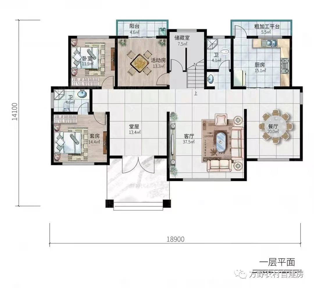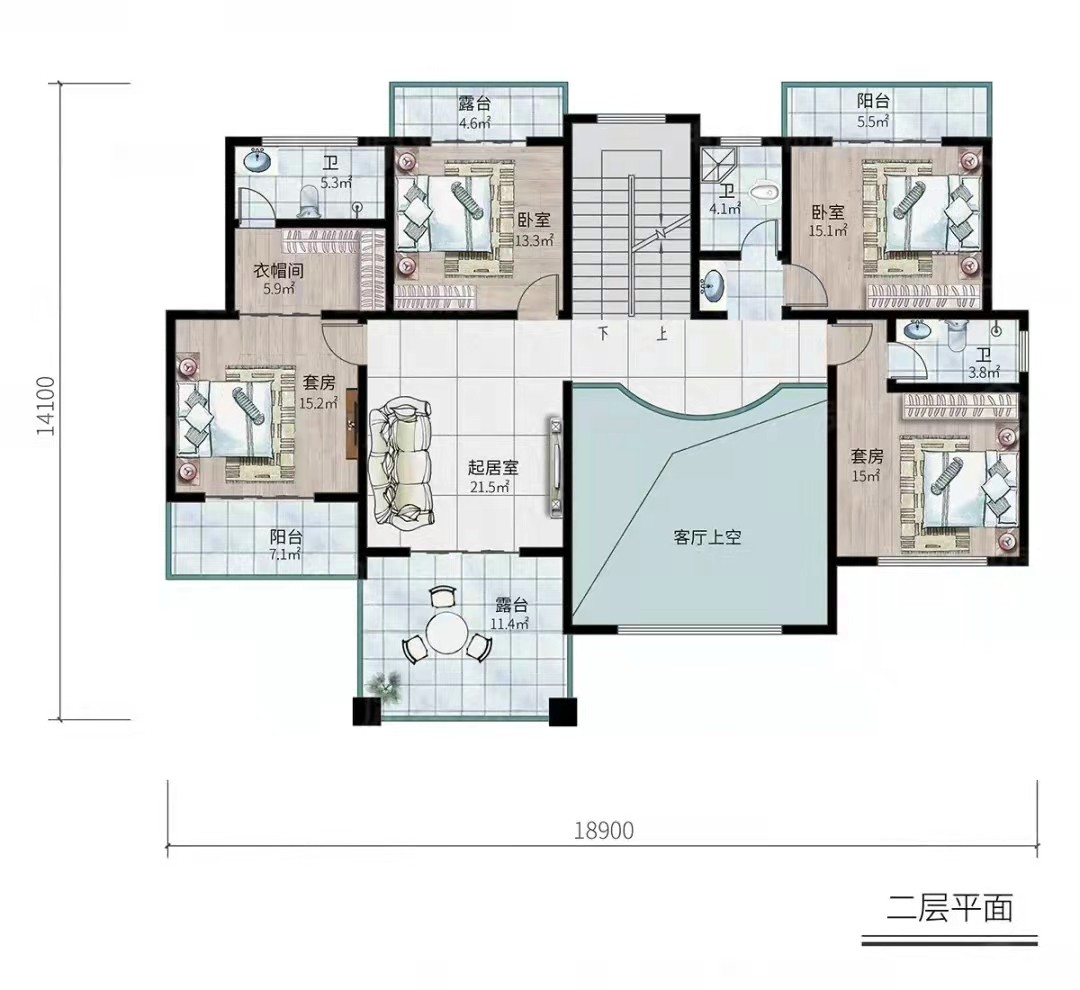 功能空间:客厅挑空、露台、衣帽间、套房