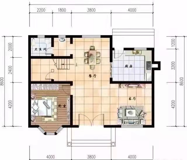 一层设客厅、厨房、餐厅、卧室、卫生间。布局合理,功能齐全,光线通透,厨房开有小门,方便食材运输,卫生间前布置有洗手区,避免了和餐厅直接接触,卧室带有飘窗,加大了居住舒适性能。