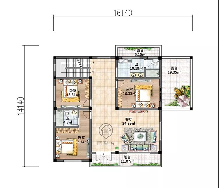 别墅二层设有客厅,三个卧室,两个卫生间,两个露台,阳台。