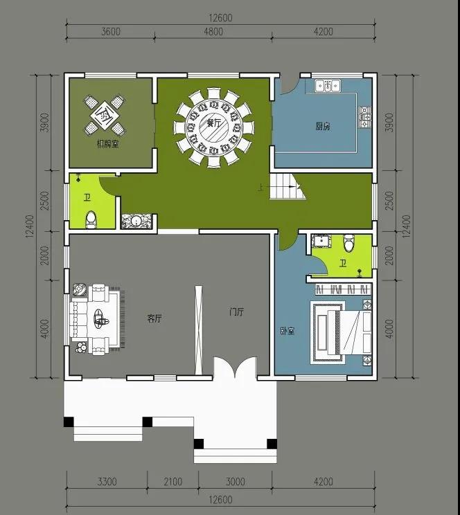 一层设门厅、客厅、厨房、餐厅、卫生间、卧室、棋牌室。功能设计完善,