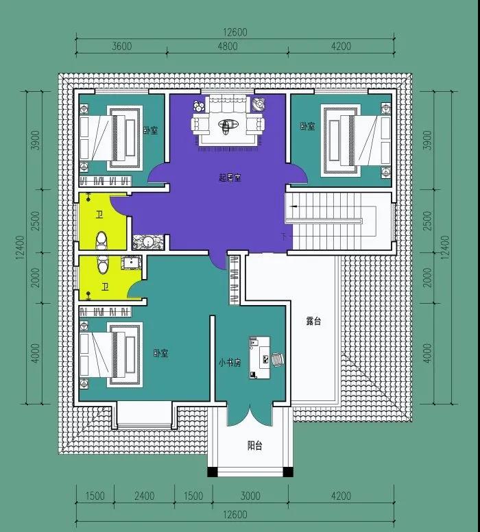 二层设起居室、3卧室、书房、卫生间、露台阳台。