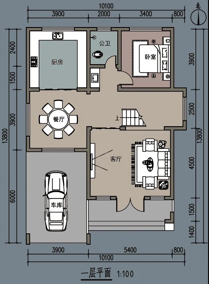 一层平面图上,我们可以看到,包括车库在内,面宽为10.1米。进门是客厅,然后是餐厅、厨房、卧室和公共卫生间,楼梯间和储藏室,一切都刚刚好,卧室恰好在距离车库最远的地方,不会影响休息。
