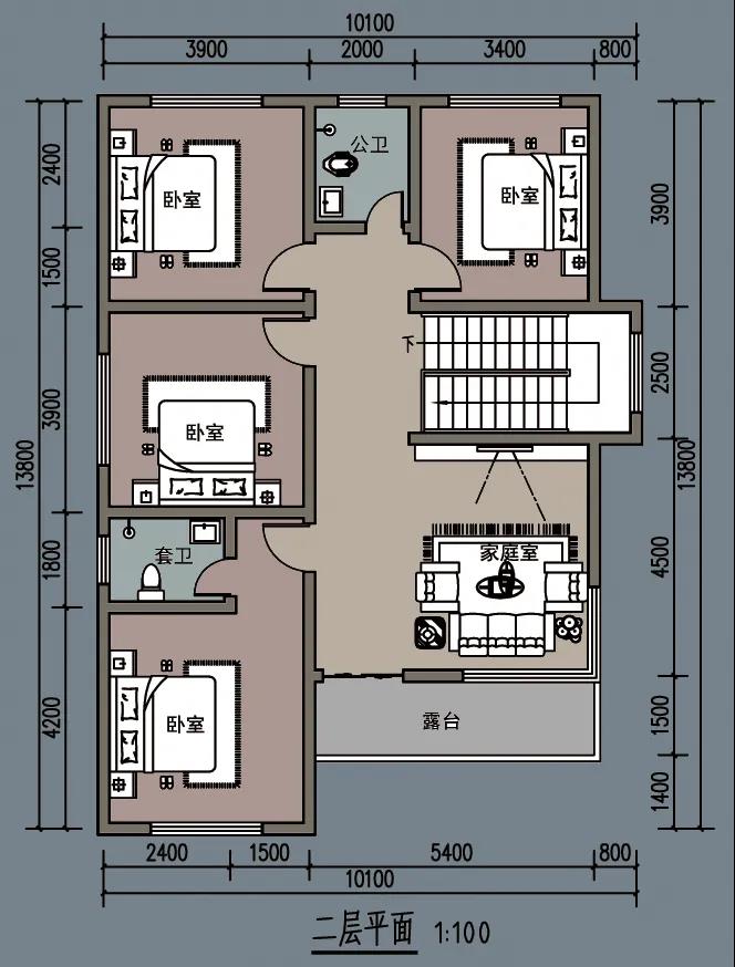 二层平面图上,是4间卧室,一间带卫生间的主卧室和3间次卧。另外还有一个公共卫生间