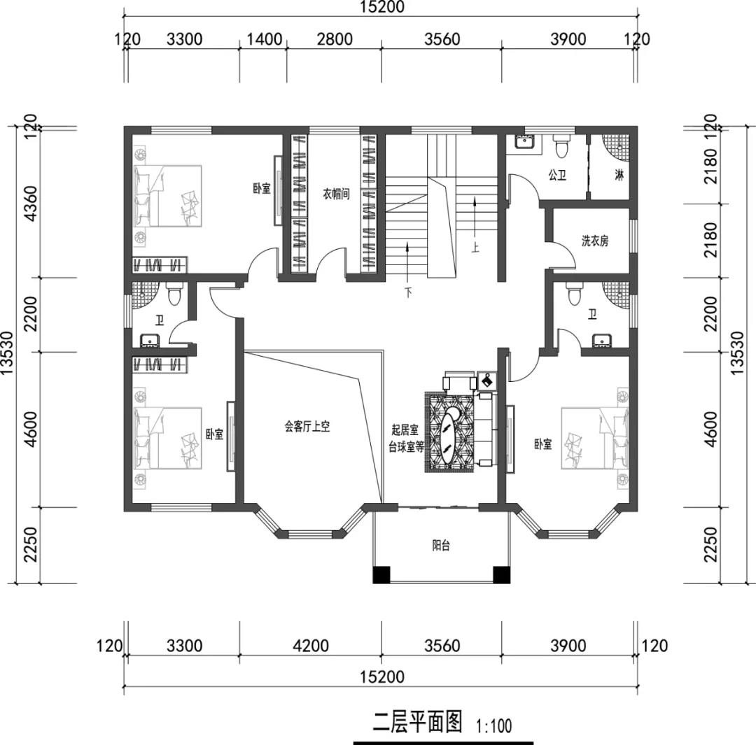 别墅二层设有起居室,三个卧室,衣帽间,三个卫生间,洗衣房,阳台。