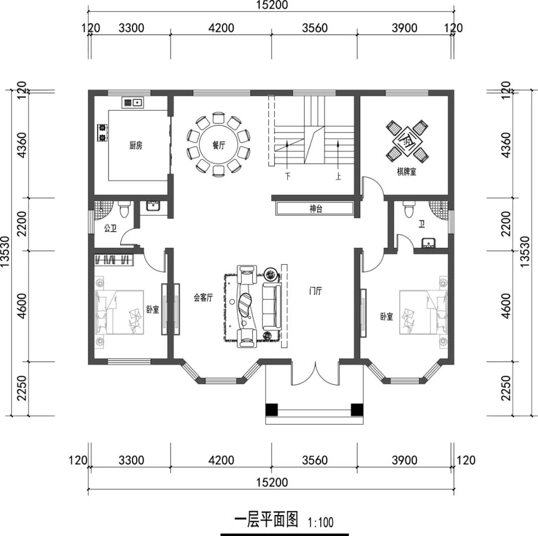 别墅一层设有门厅,客厅,餐厅,厨房,两个卧室,两个卫生间,棋牌室。